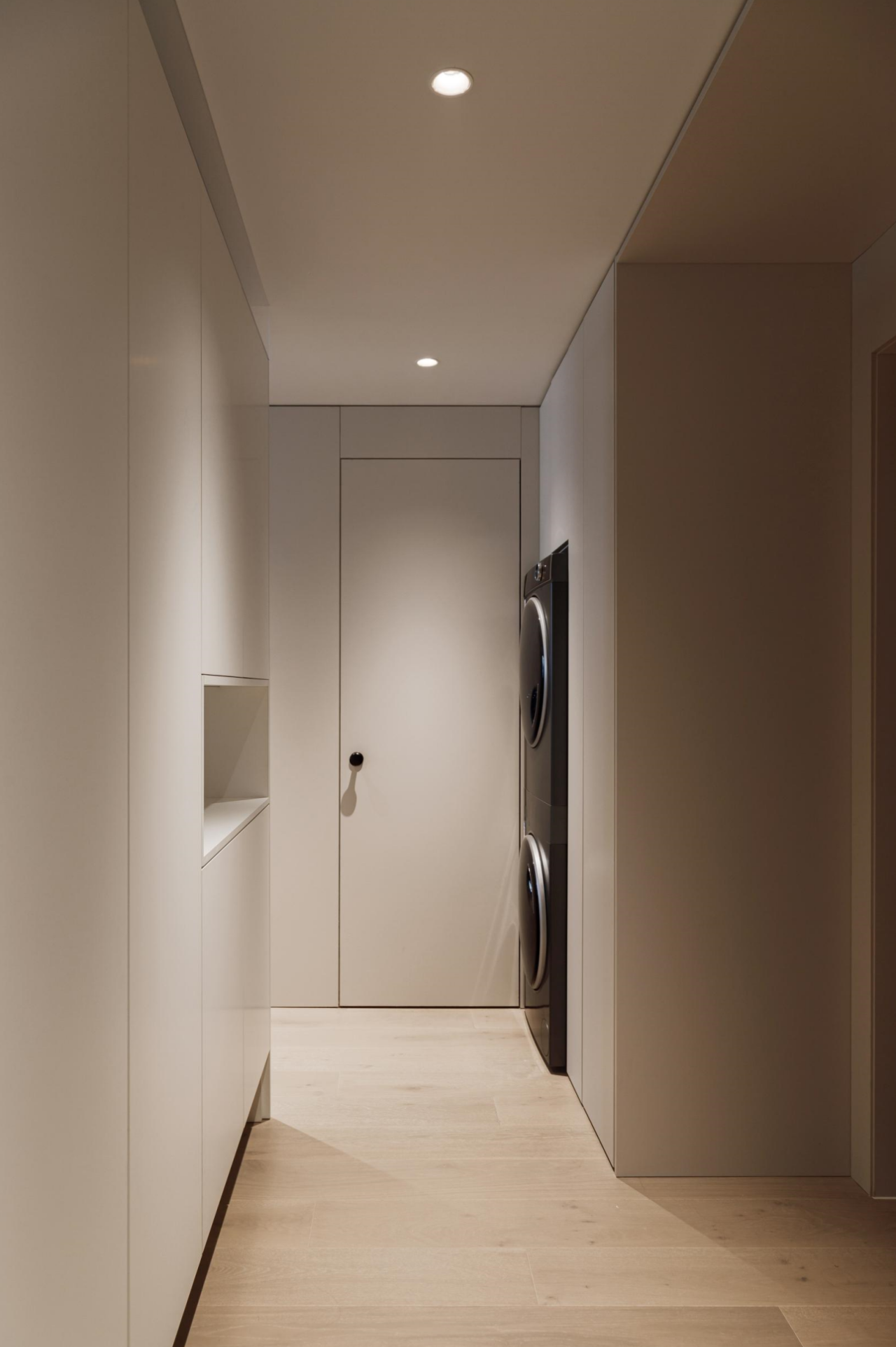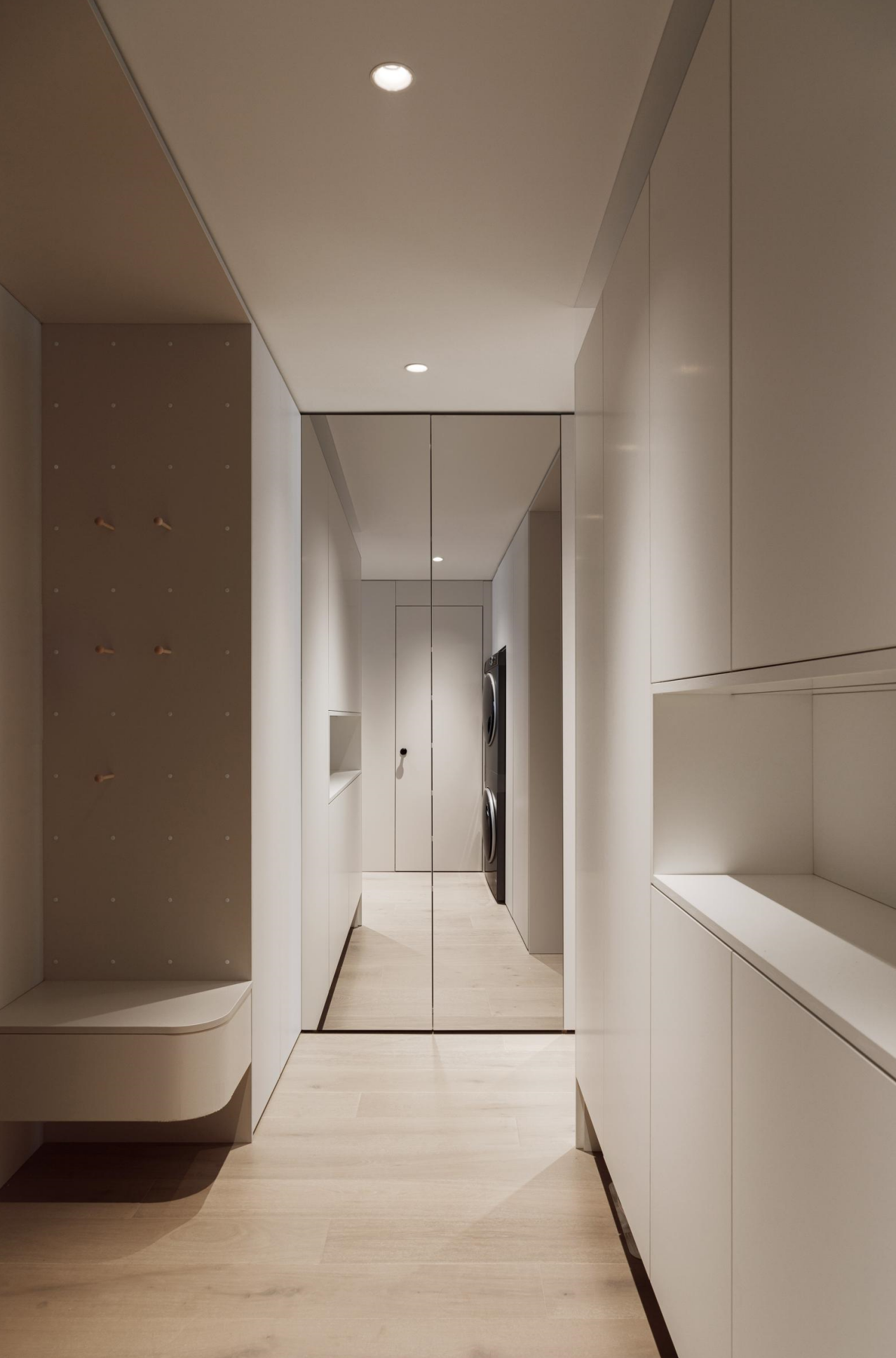 置入玄关柜后为入户增加视线遮挡和过渡空间,同时附加了衣帽柜、洗衣机、烘干机等收纳和家政区域的功能。