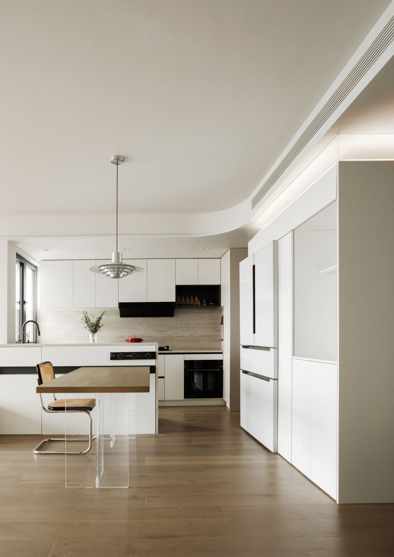 出于采光、动线、互动性等多方面考虑,我们将封闭厨房改为开放式厨房,与岛台、餐厅结合,形成开放、包容的空间场域。多元通透的布局实现最大化的空间利用,促进家人间的情感互动、丰富生活场景。