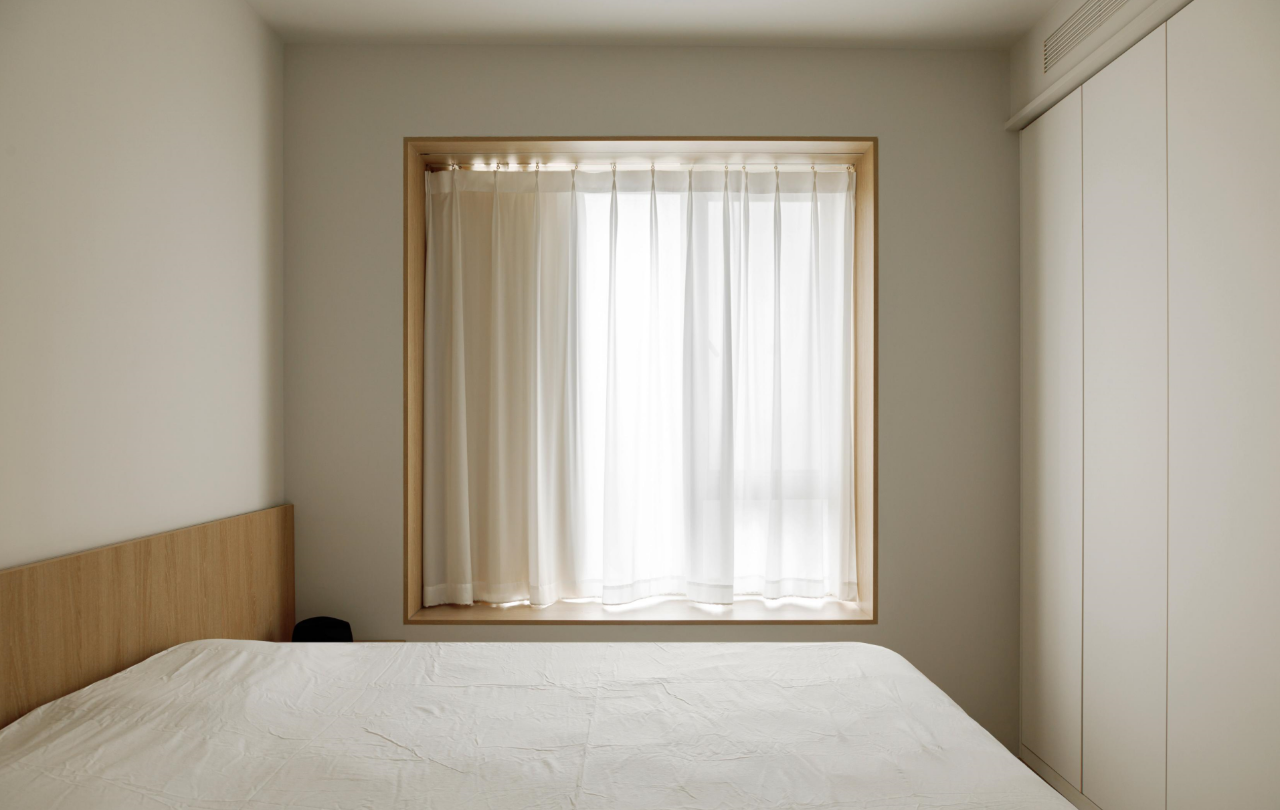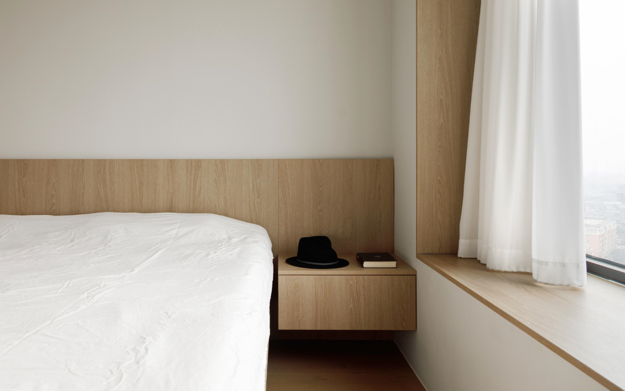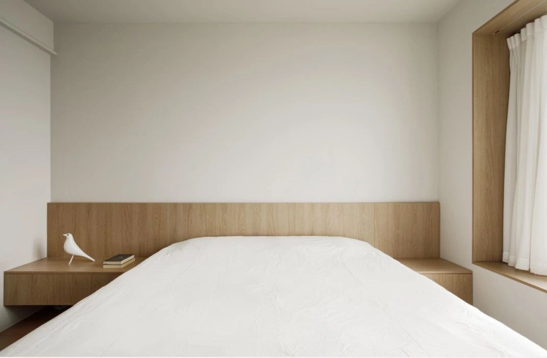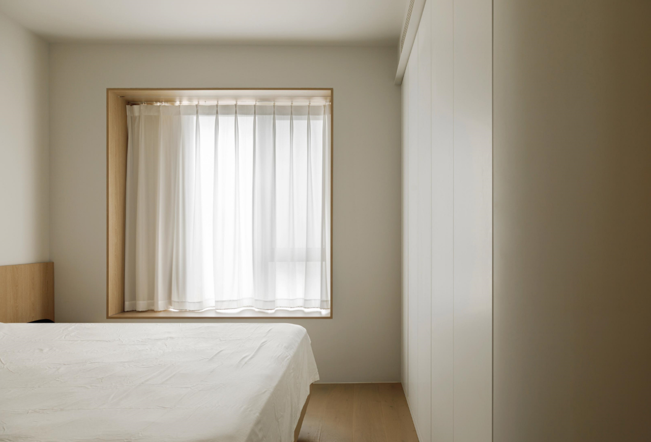 卧室风格温暖中性,以白色搭配木色,营造简洁、舒适的空间氛围。预留整墙收纳,满足生活储物需求。