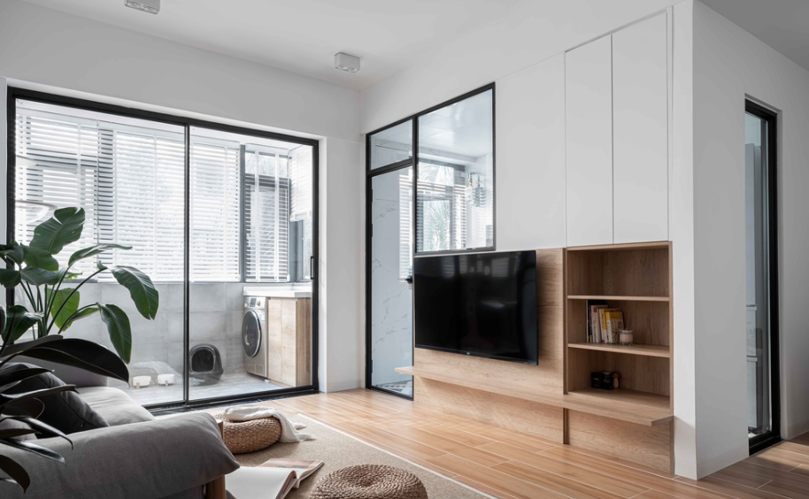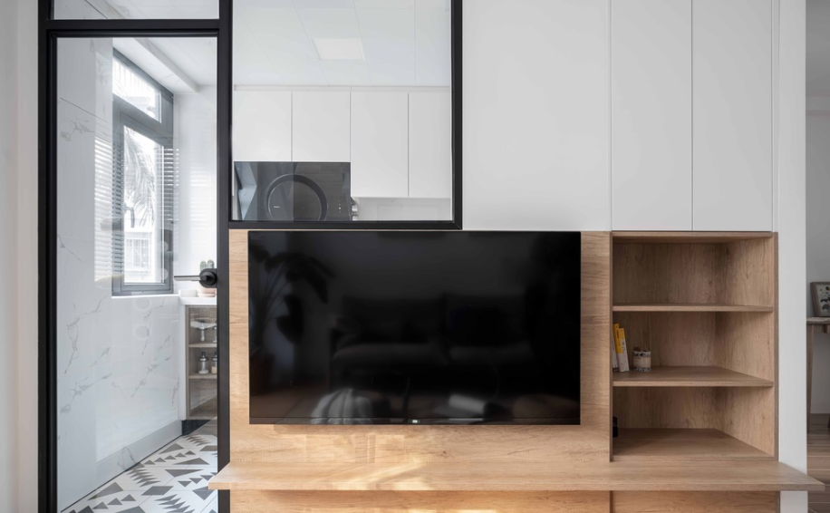电视背景墙上开了新的窄边框门窗,在视线上可以增加厨房与客厅间的通透性。阳台封窗,将其纳入室内空间;但我们依旧在客厅与阳台之间加了窄框玻璃门,因为屋主想有效的管理两只猫大人平时的卫生与气味。
