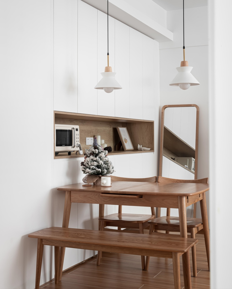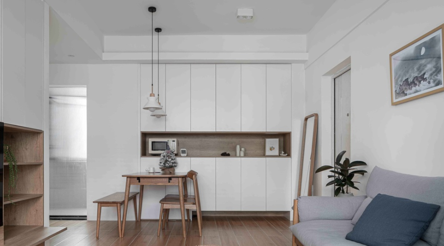 餐边柜采用“一体嵌入式”设计,不会让柜子突出;顶天立地的一整面大柜子极大增加小户型的收纳。