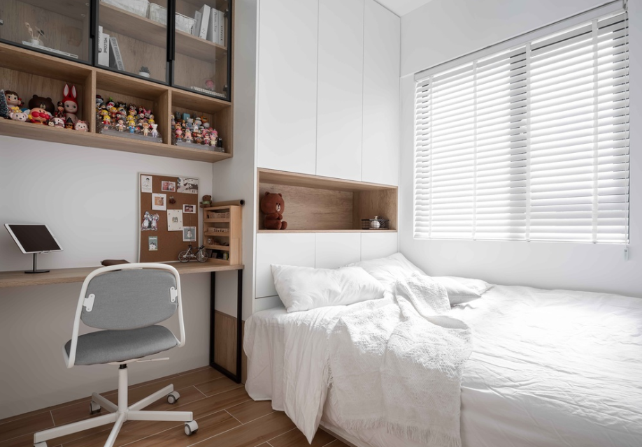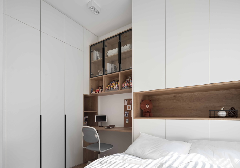 榻榻米+书桌+书柜+衣柜一体式的设计,最大程度增加收纳空间。你睡你的,我看我的...
