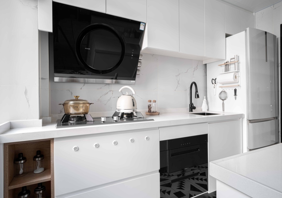 厨房用白色作为主基调,黑色抽烟机+水龙头+洗碗机等黑色物品为点缀。经典的白+黑碰撞在一起,简单纯粹。