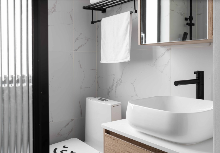 卫生间的镜子是直接装在吊柜的柜门上,一物两用,节省了很多空间。