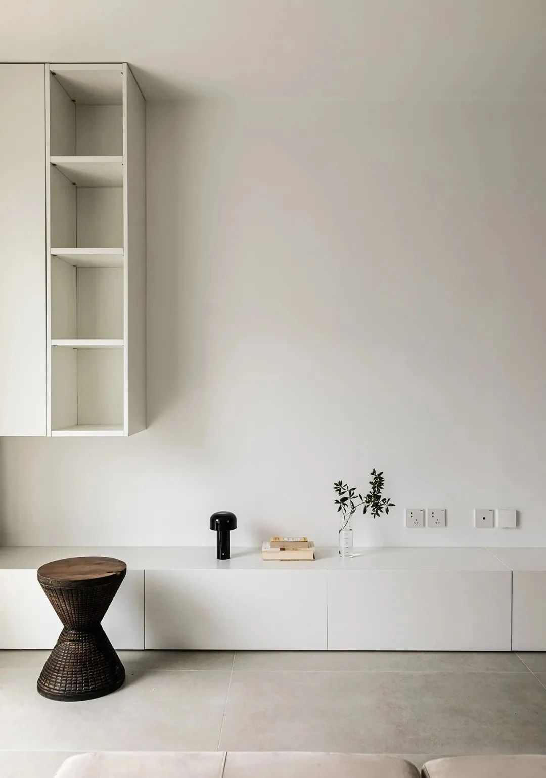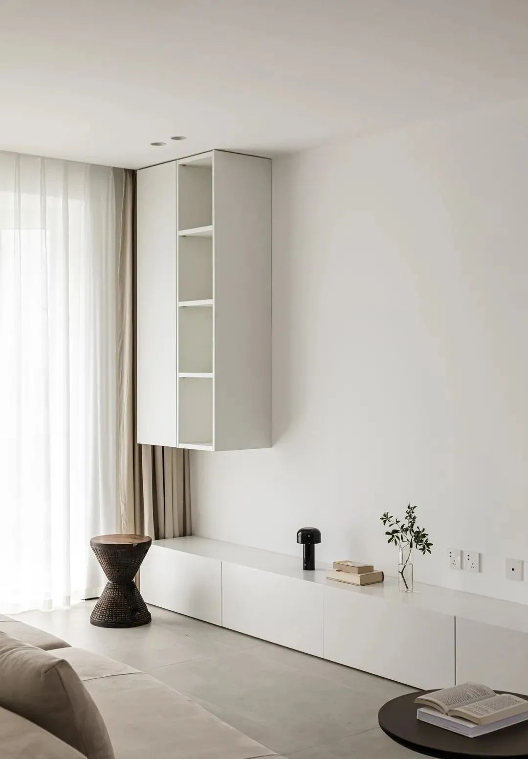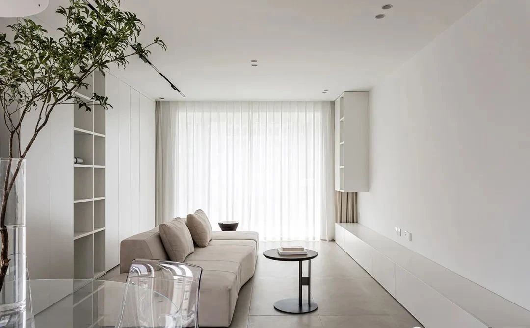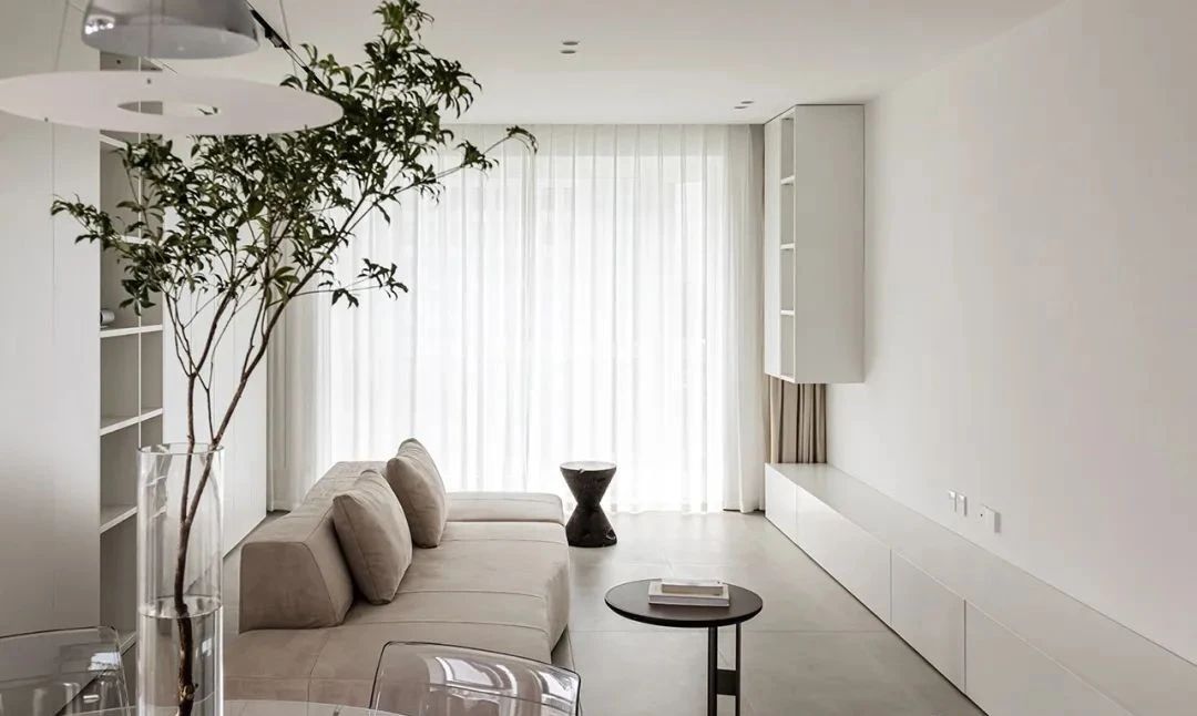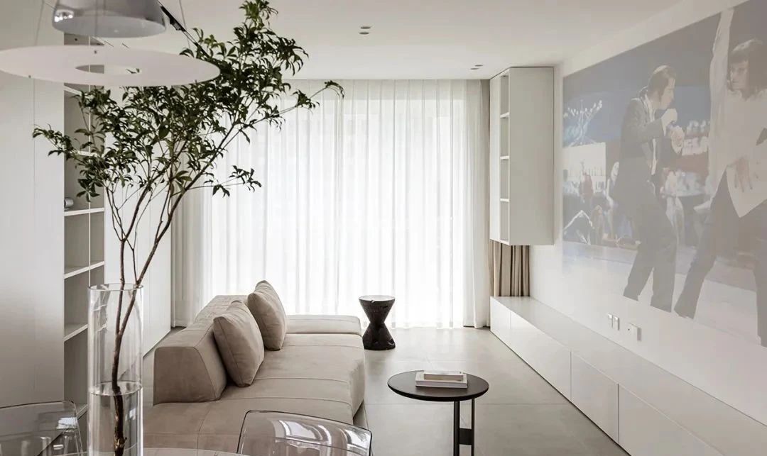 客厅,沙发墙定制了整面墙的收纳柜,柜体进深35cm,提供了充足的收纳空间,布局藏露有序,兼具颜值与实用性。电视墙设置了地柜+悬空吊柜的组合,没有多余的装饰,整洁大方有质感。采用投影幕布代替传统电视,在家也能有影院级享受。