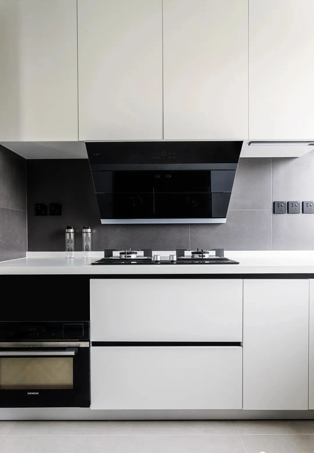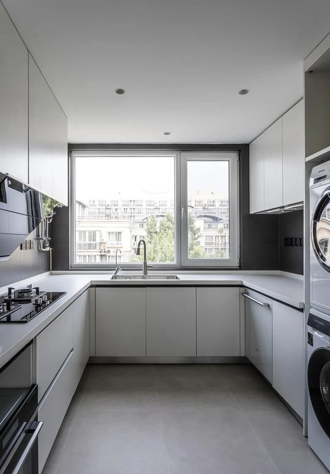 厨房,定制了U字型的橱柜布局,并将烤箱、洗碗机嵌入进柜体,动线十分合理,让下厨变得更加轻松。将洗衣机、烘干机叠放进高柜中,满足了洗衣晾晒的功能,解放了阳台空间。