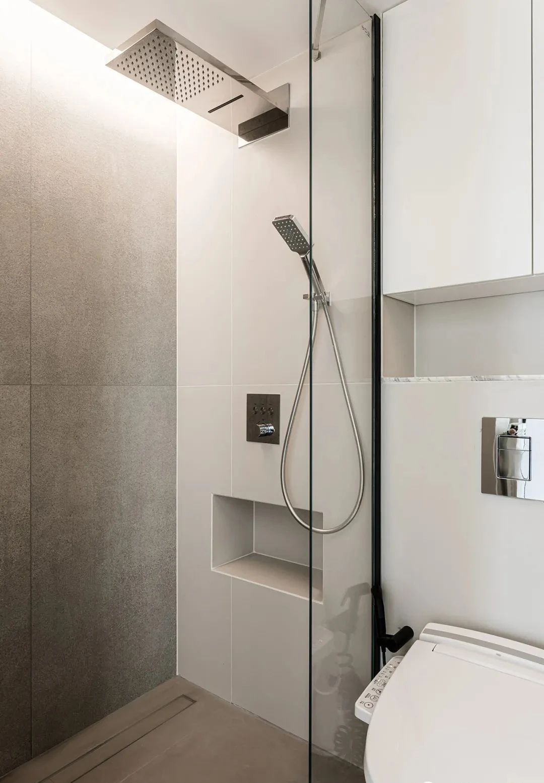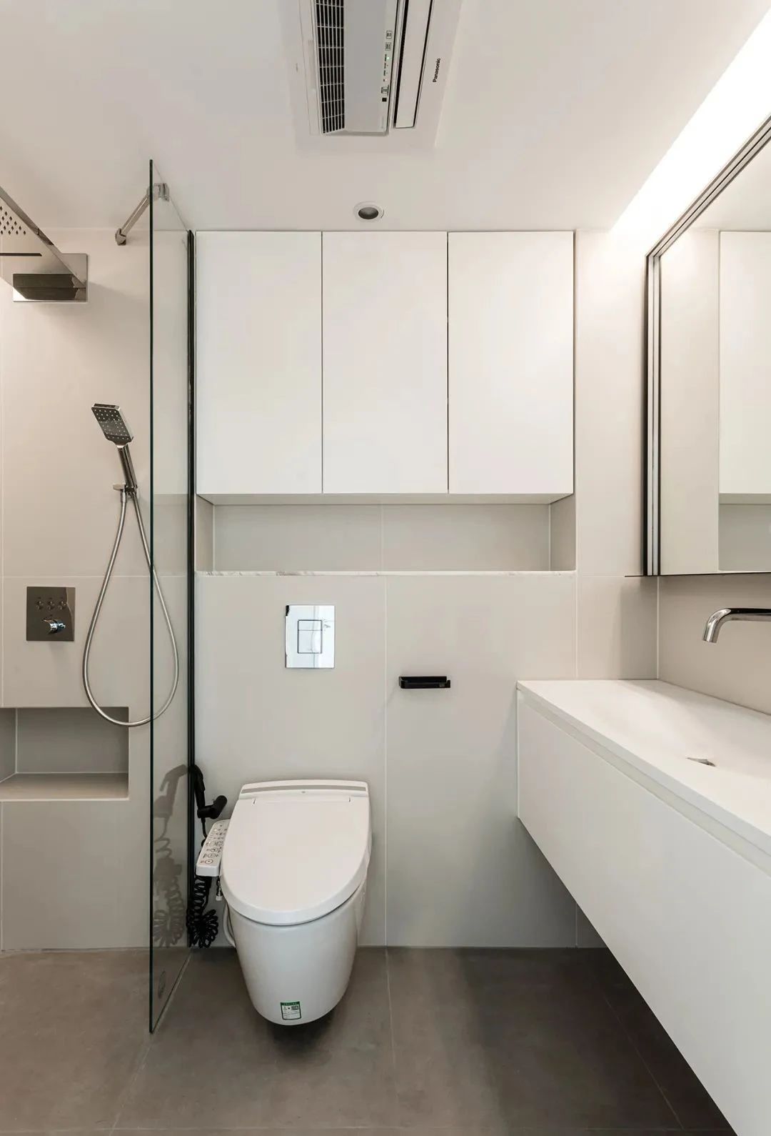 卫生间,整体以灰色调为主,设置了悬空浴室柜、吊柜、壁龛,丰富了收纳功能。