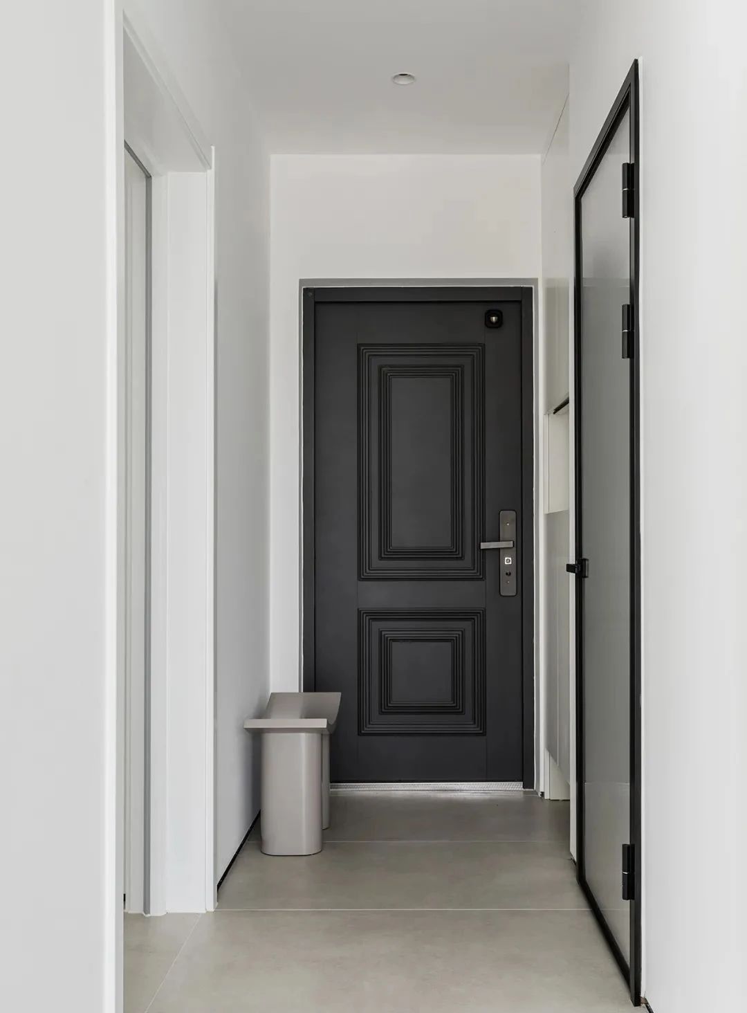 入户过道式玄关,进门左手边定制了嵌入式鞋柜,下面留空放常穿的鞋子,中间留空放随手小物,既美观实用,还不占用入户空间。