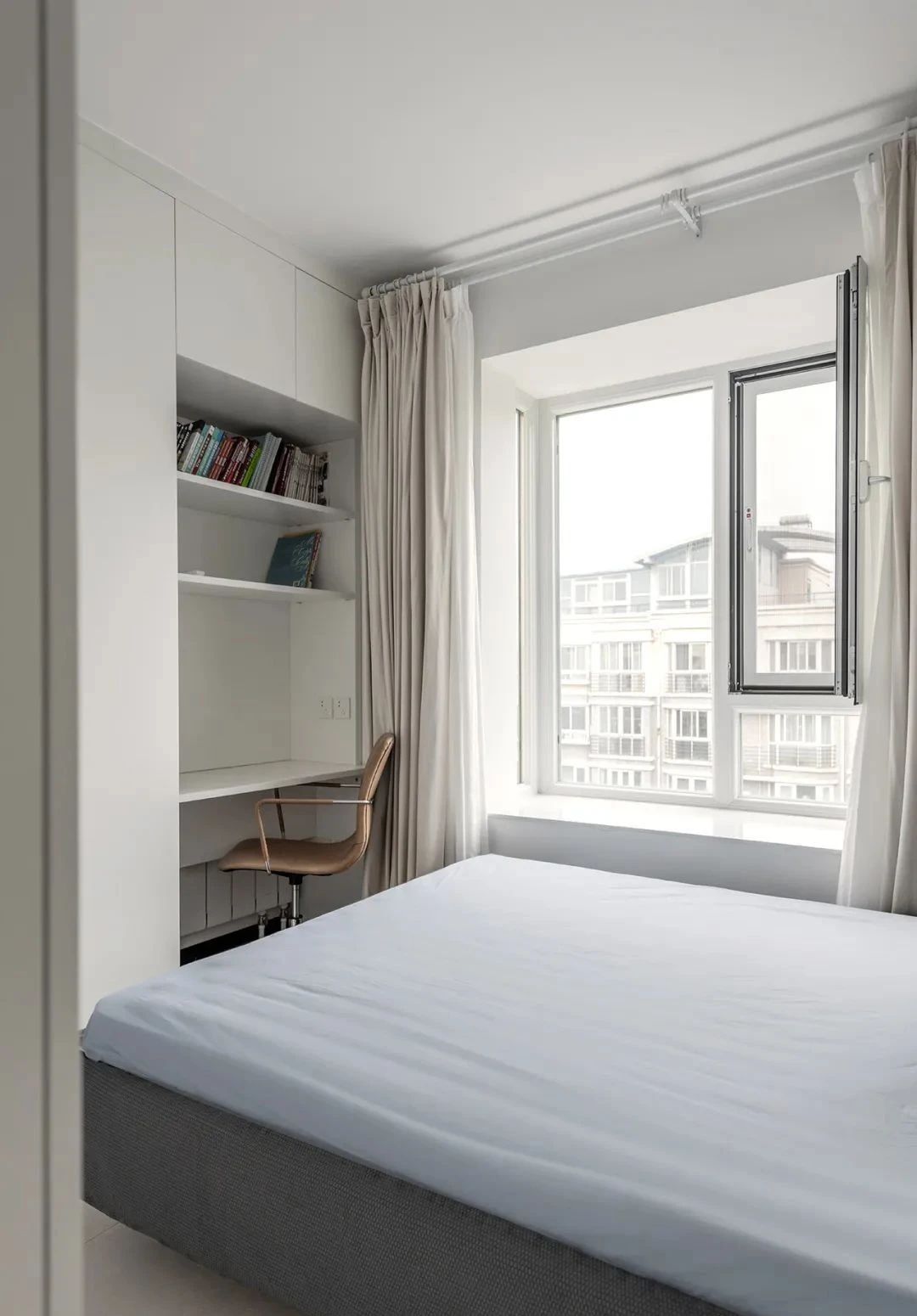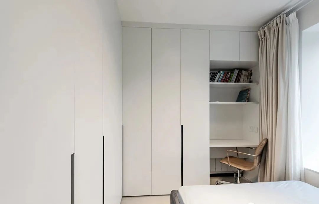 次卧,定制了两面墙的转角收纳柜,并加入了书桌功能,满足了居住、办公、收纳等功能需求,大大提高了空间利用率。