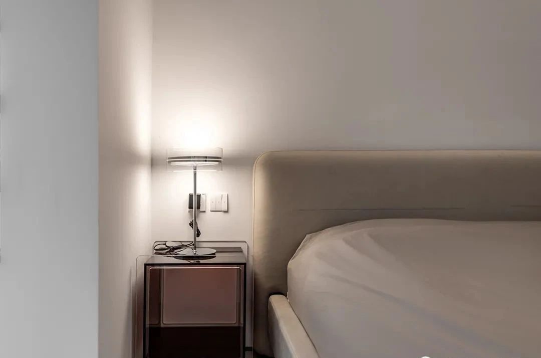 主卧,整体以中性色调为主,墙面大面积留白,没有多余的装饰,营造出柔和宁静的睡眠氛围。