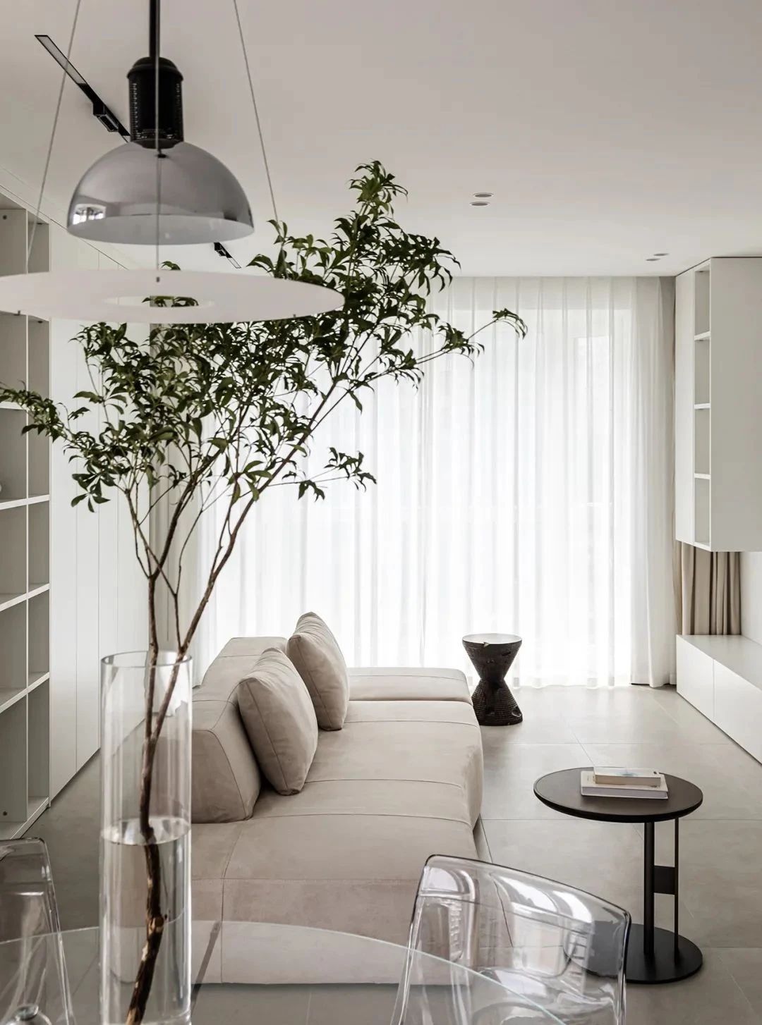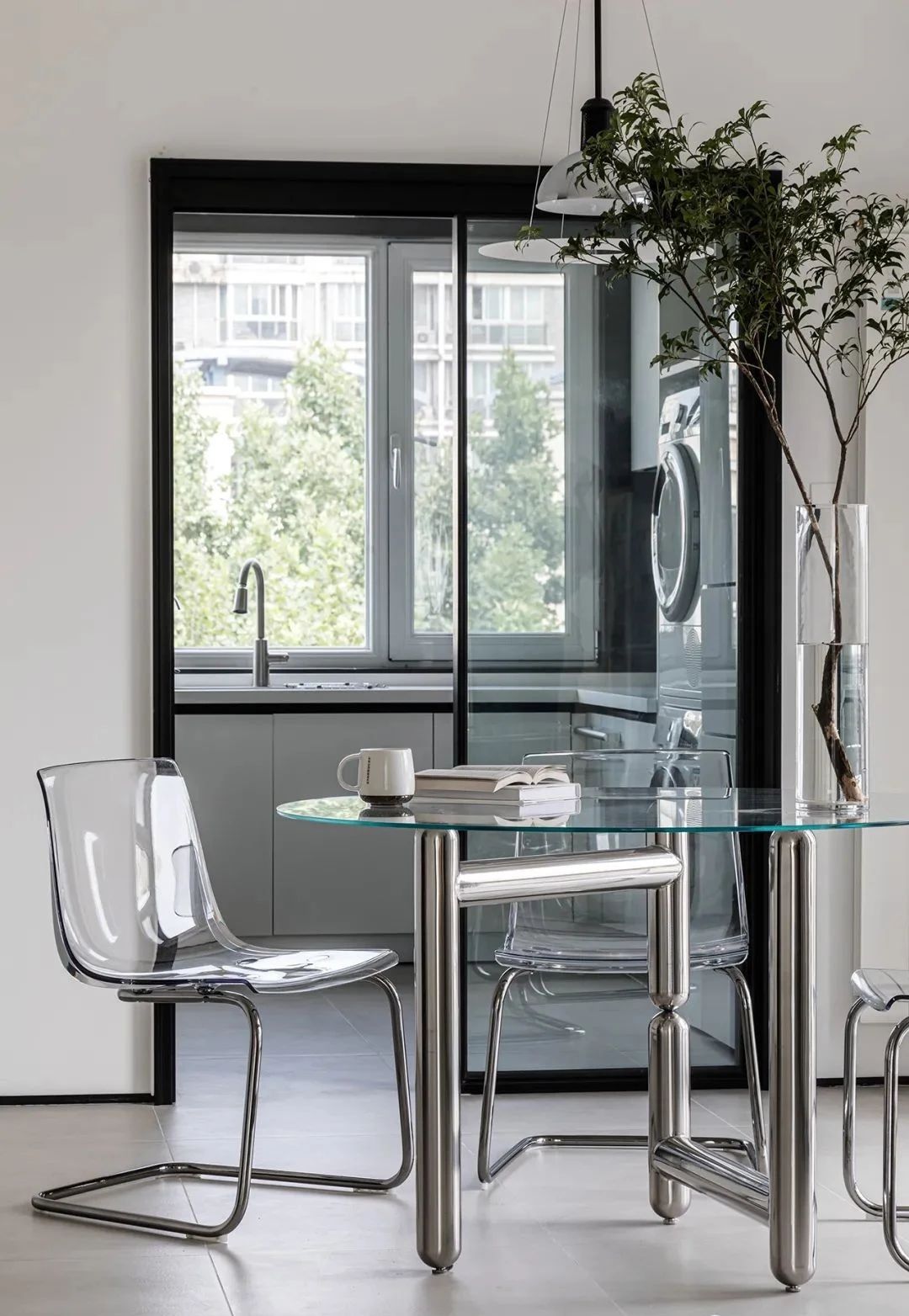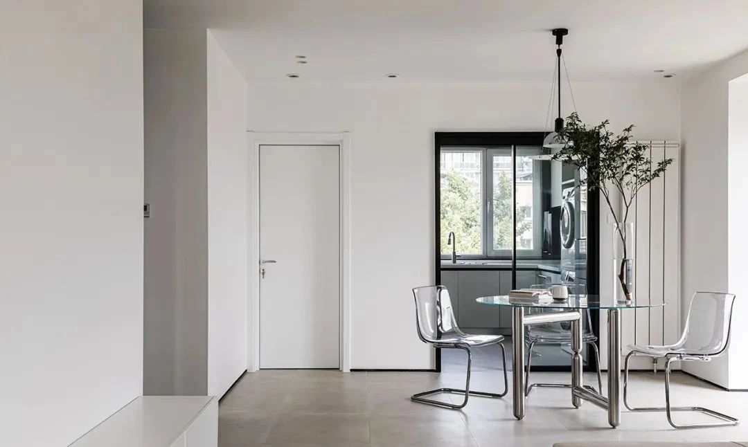 出来玄关就是餐厅空间,选用了玻璃圆桌和透明悬臂餐椅,通透又轻盈,搭配飞碟造型的吊灯,营造出灵动大方的就餐氛围。