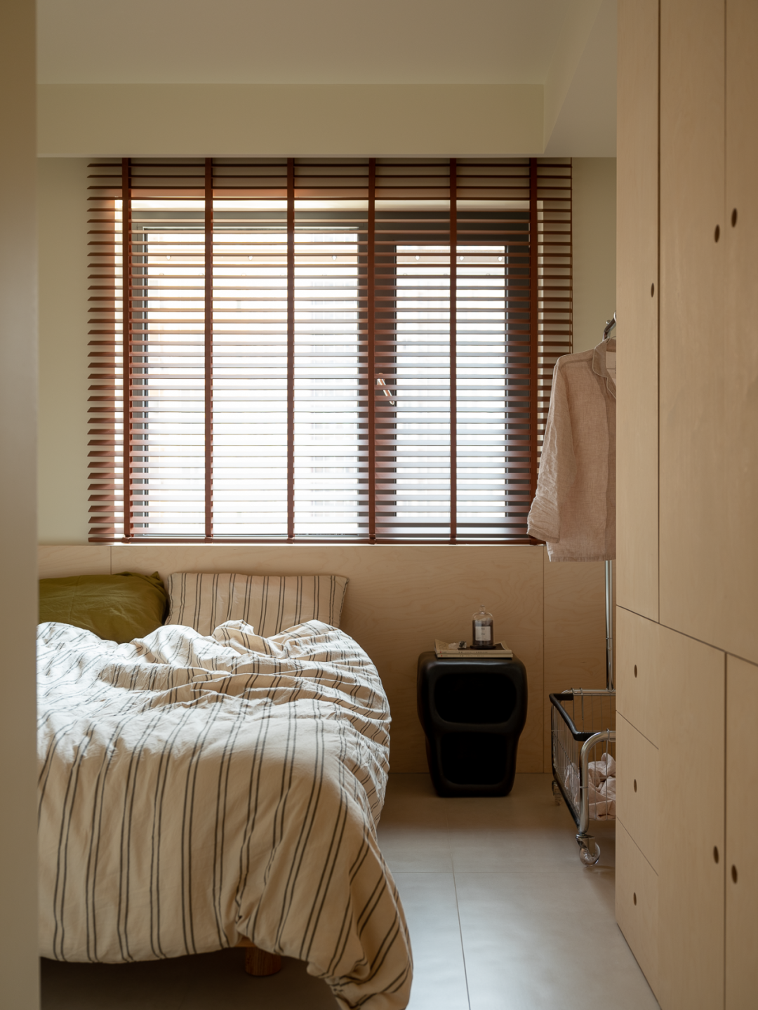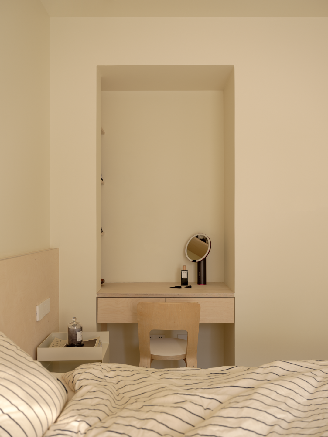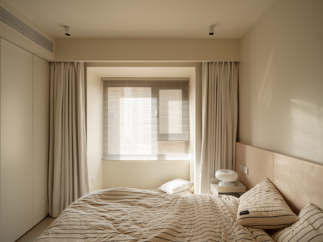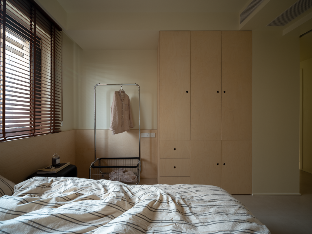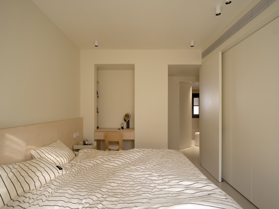 卧室除了满足睡眠区,收纳功能的以外,还增加了梳妆台的功能。床尾是一整面的收纳柜,奶白色的空间清爽明亮,小空间也能在保证功能的同时做到舒适温暖。