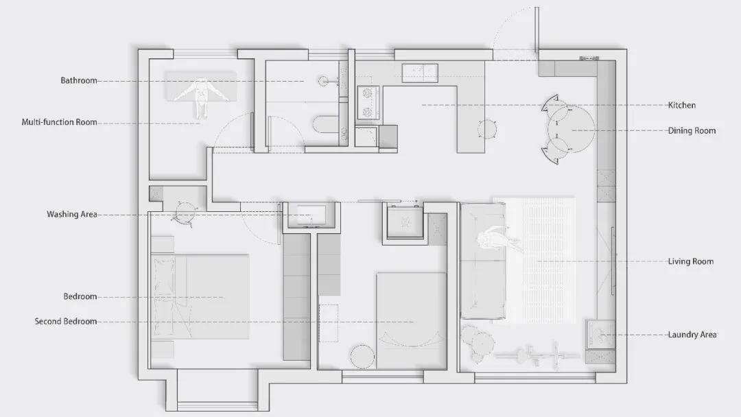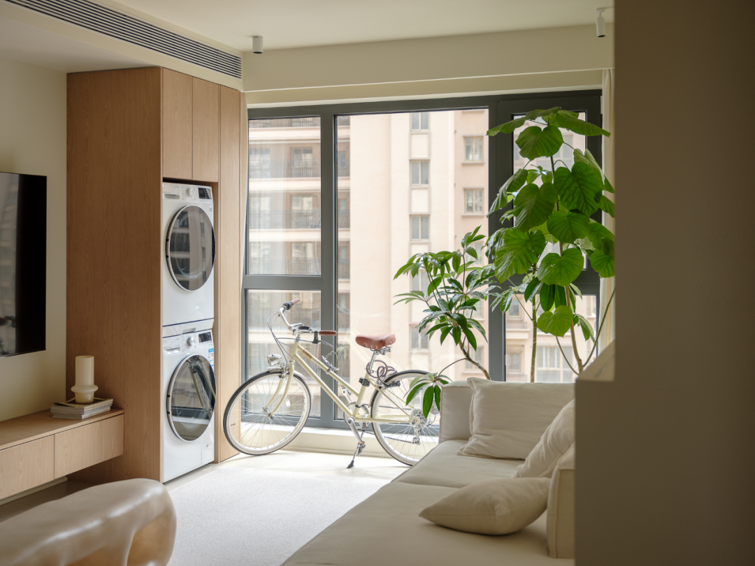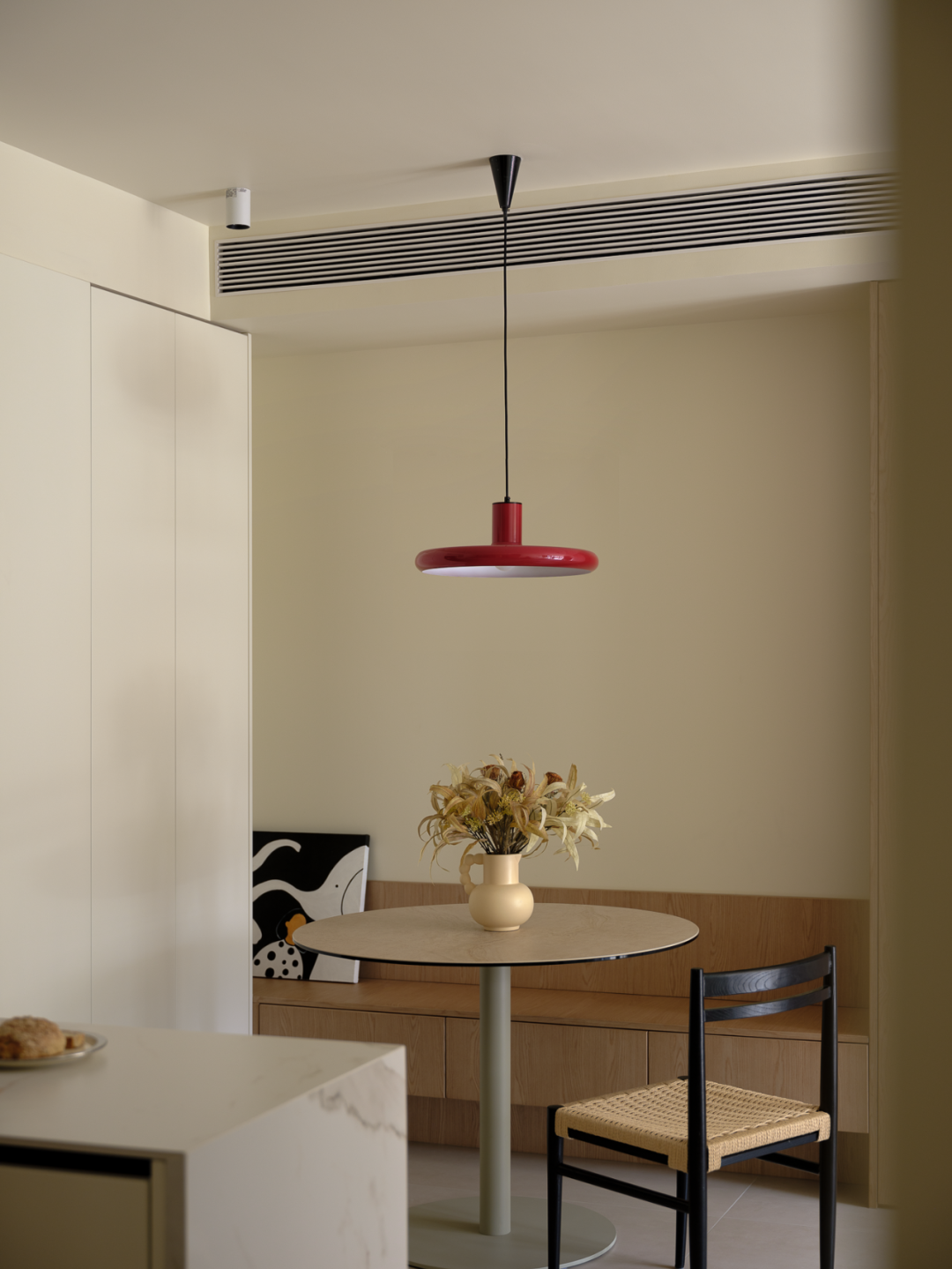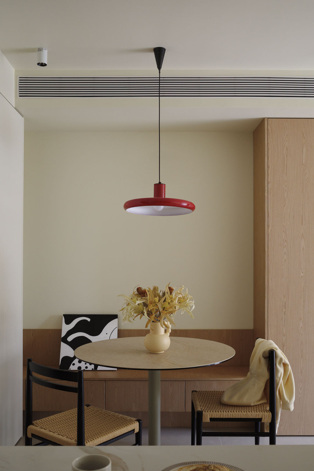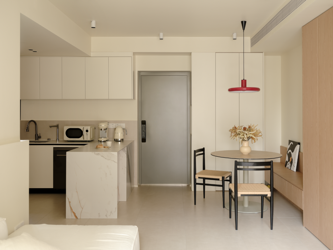 小圆桌、卡座、无把手收纳柜、空间视觉上简单整洁,将收纳隐于无形。