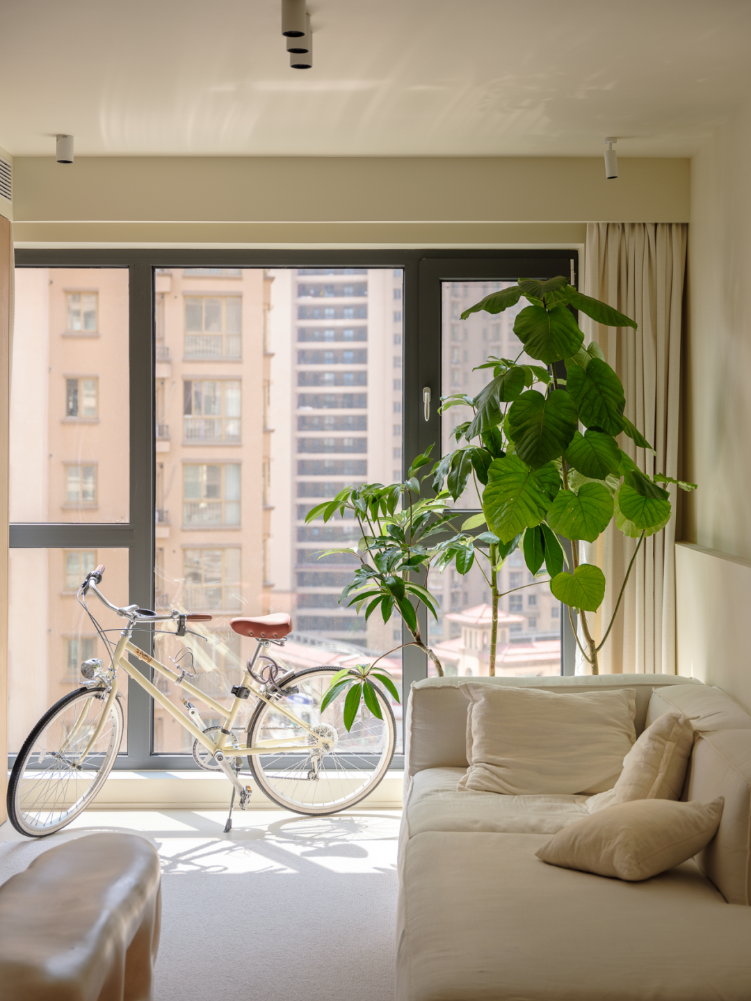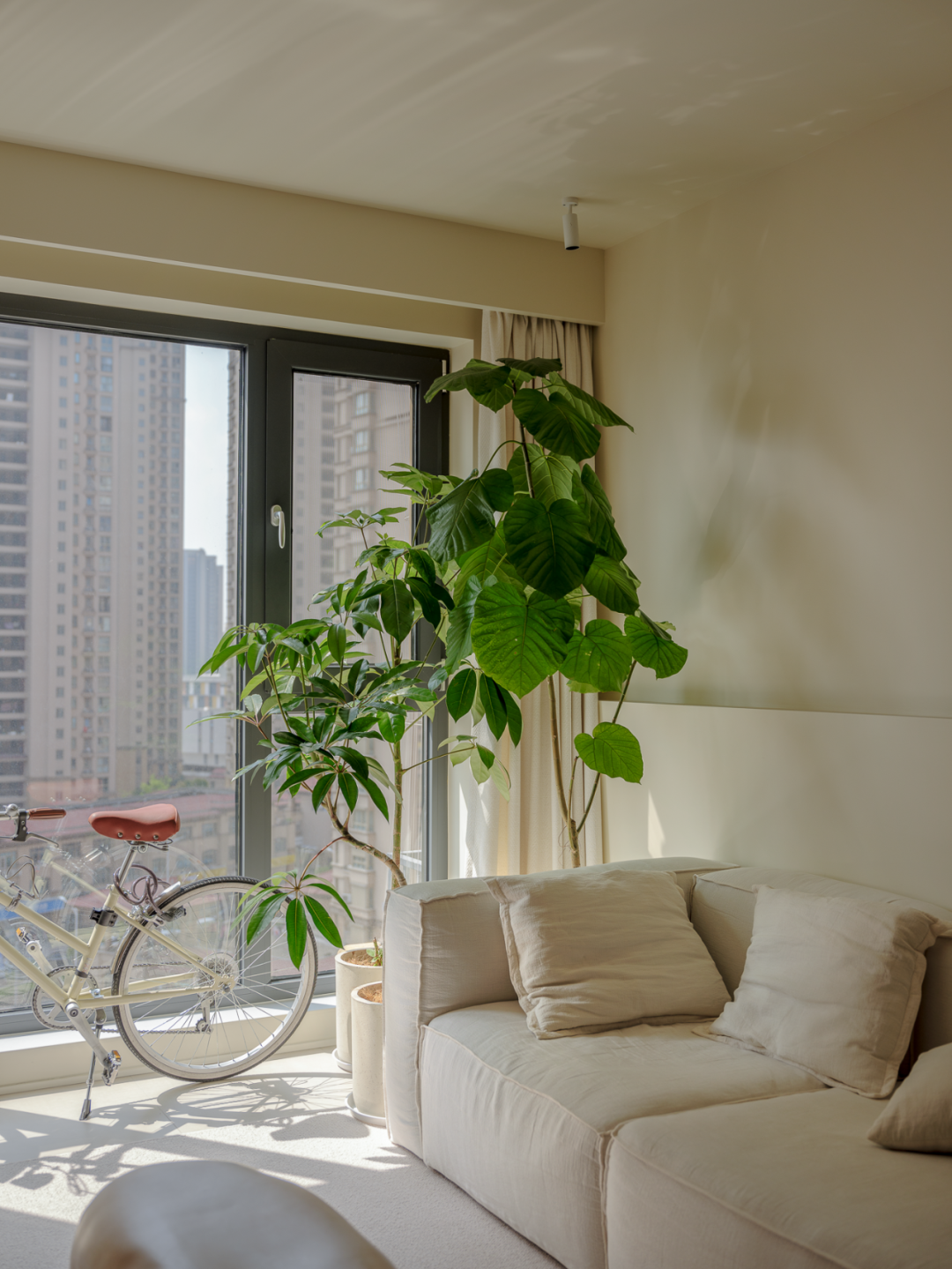 客厅大面积采用浅暖色系的涂料,墙顶面统一颜色,家具搭配浅色布艺沙发,绿色植物点缀。