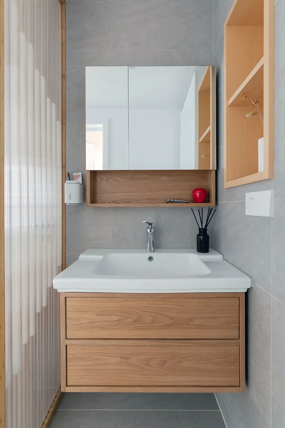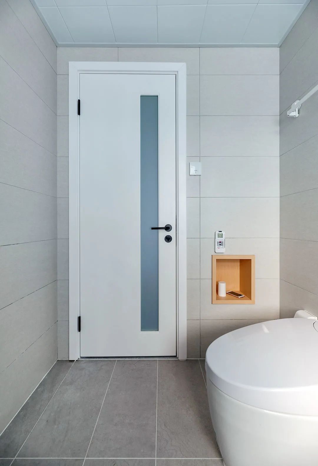 卫生间内部整体以灰色+白色搭配,让整个空间更加干净整洁耐看。马桶区同样设计壁念,取代纸巾架,整体效果更统一。