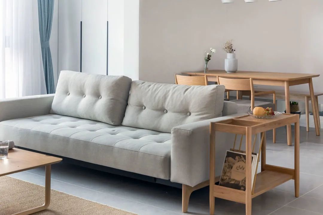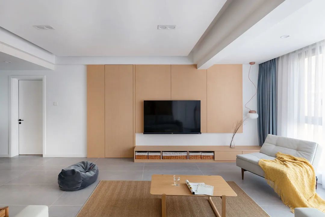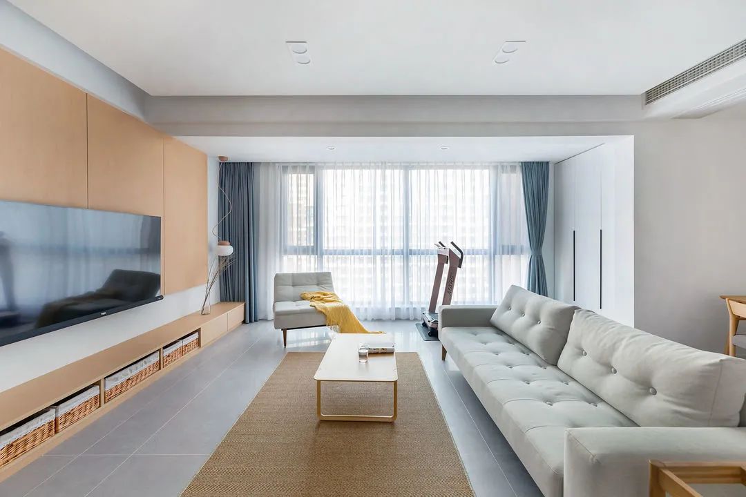 客厅的设计简洁大方,打通阳台不仅空间更加宽散,采光也更直接。嵌入式的置顶收纳柜保证了客厅的生活收纳需求,放置一台跑步机就是屋主休闲健身场所。