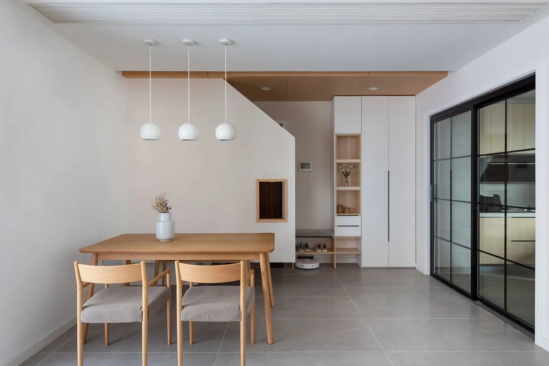 进门玄关处,设计师沿入户拐角墙新建造型隔断,缩小玄关空间,扩大客厅整体使用面积,玄关墙悬空与造型洞的设计,避免了入户视觉的呆板,同时改善了采光。