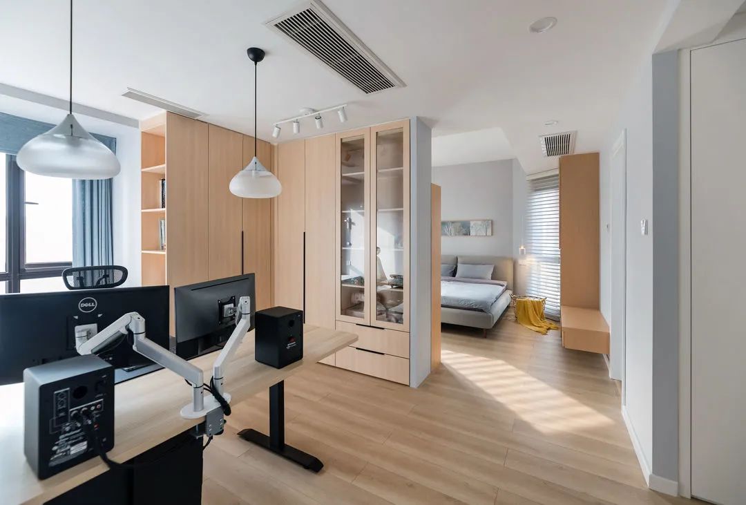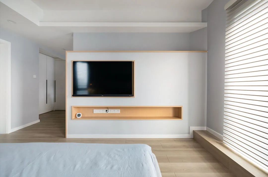 卧室多面落地窗采光,百叶帘可以营造不同的卧室氛围。简洁舒适的设计,让空间更显自然轻松。拆除原有隔墙,用电视墙和书柜结合的形式做隔断,一墙两用。