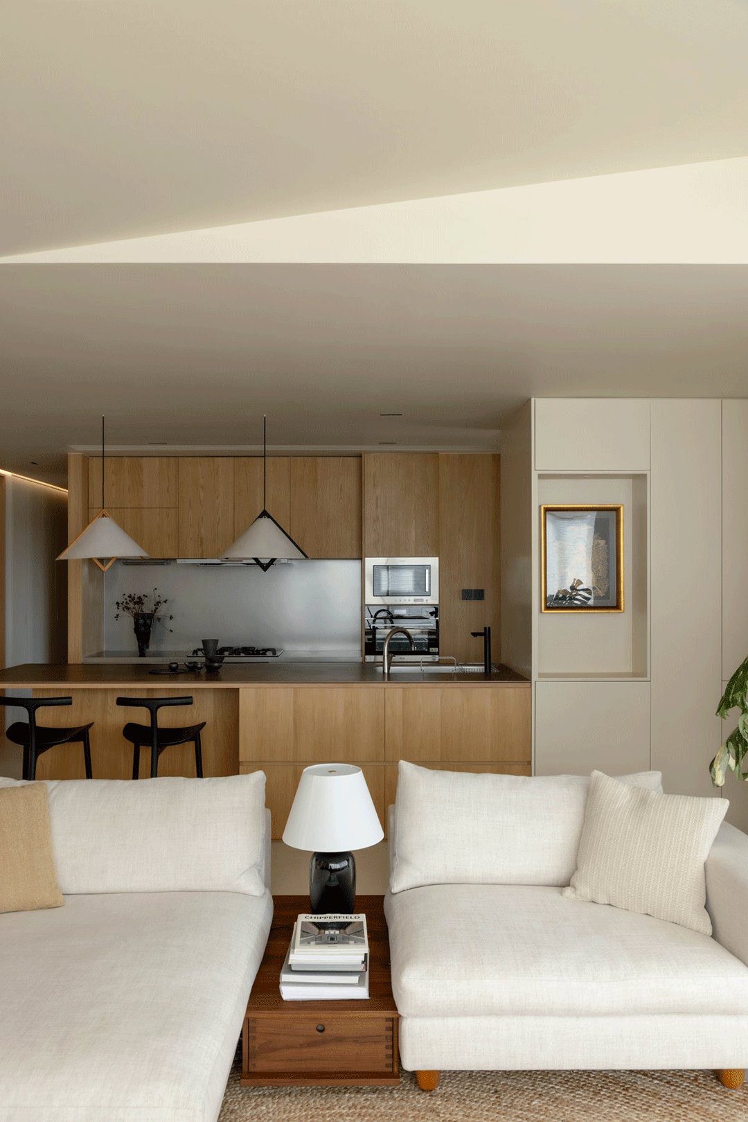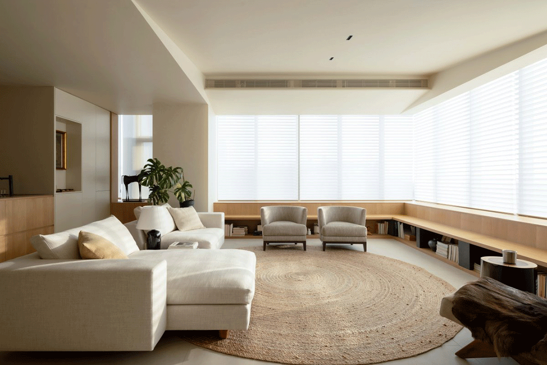客厅地毯纹路仿佛树木年轮,呼应木质材料,搭配绿植,营造自然活静的氛围。