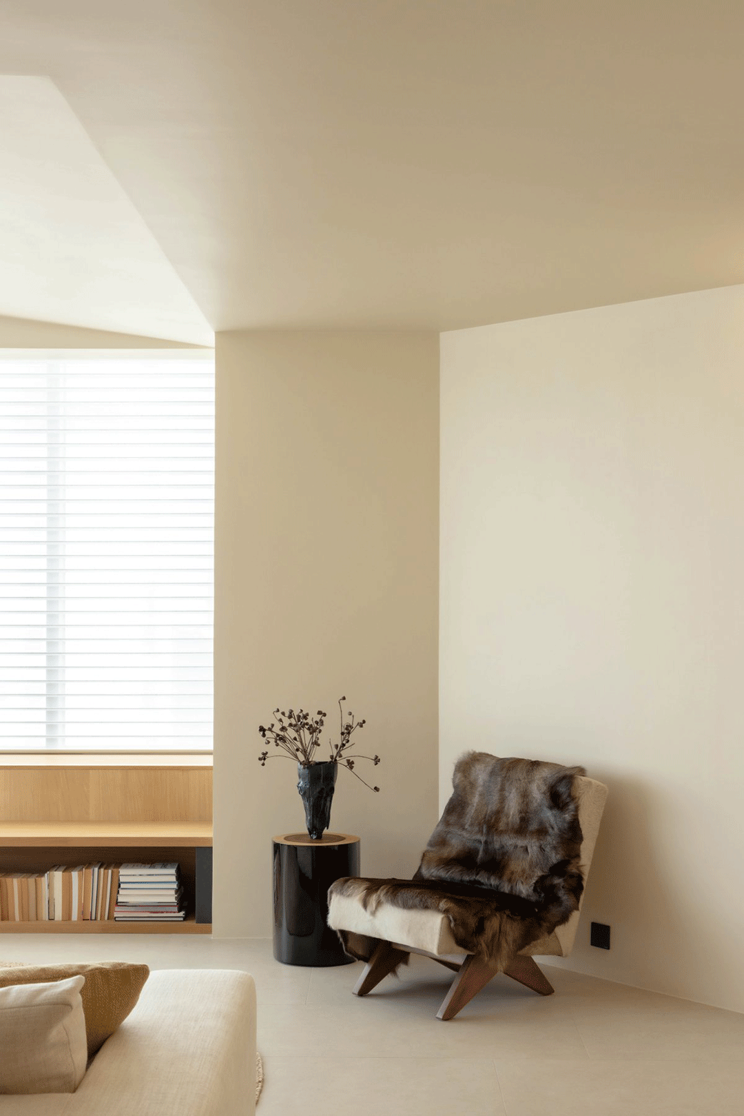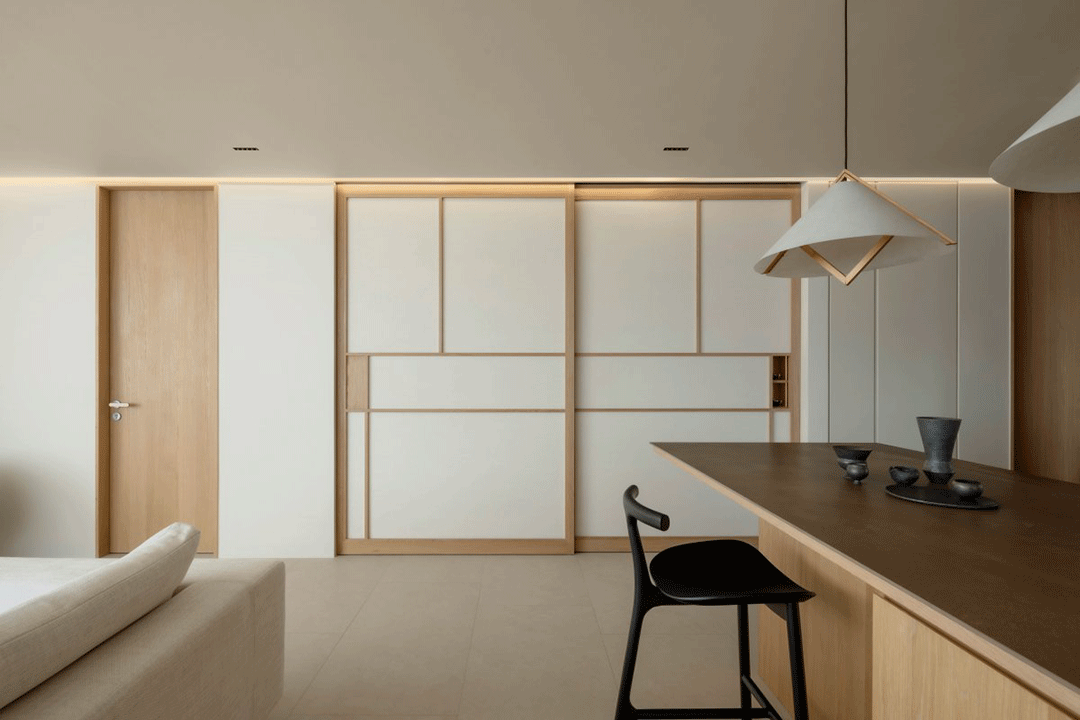 卧室空间延续整体简素基调,大面积留白点缀少部分线条,一体式的家具设计则让空间更显简练。木与白的配色舒适活静,晕染柔和自然光线,给人岁月静好的感受。