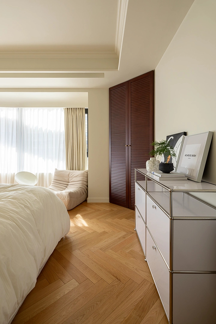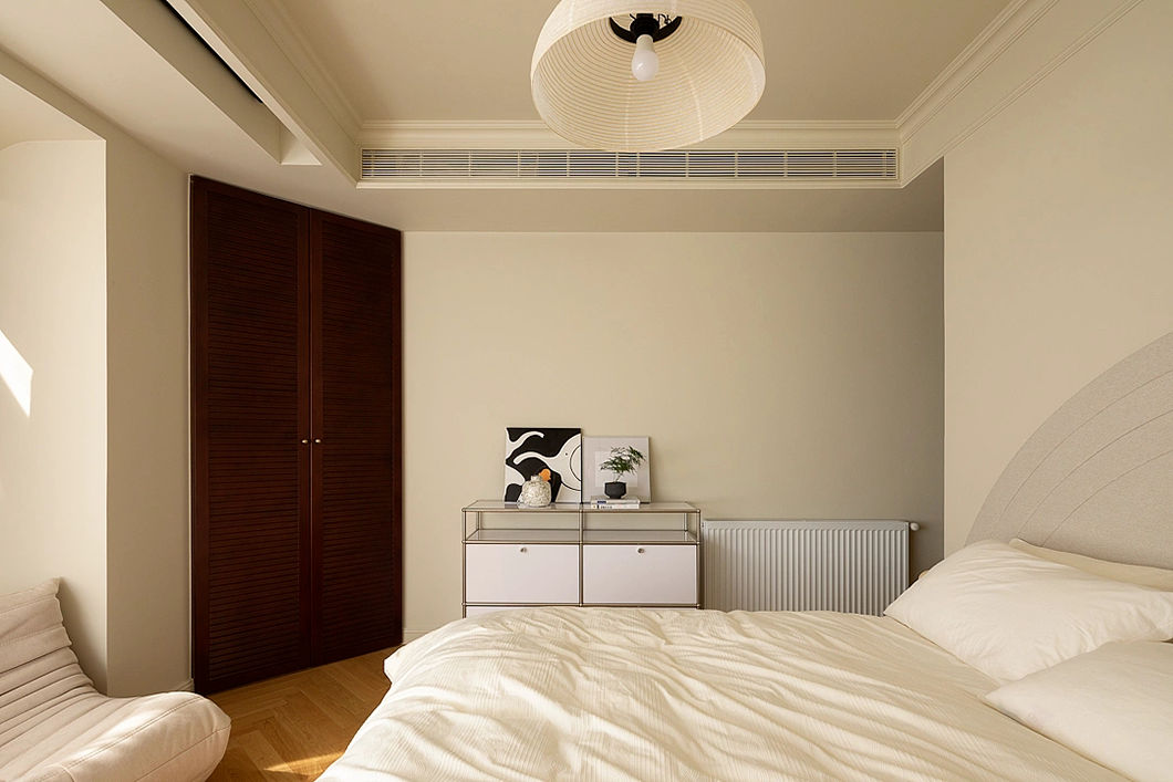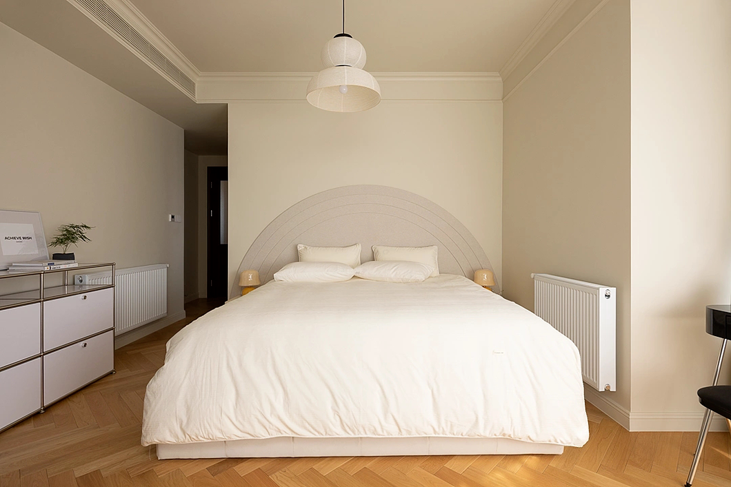 卧室采用了对开门,古朴的颜色,即增加了隐私性,又方便开门关门。半圆形的床头设计,结合洁白床品和白色柜子,简洁大气,随时都可以释放压力。