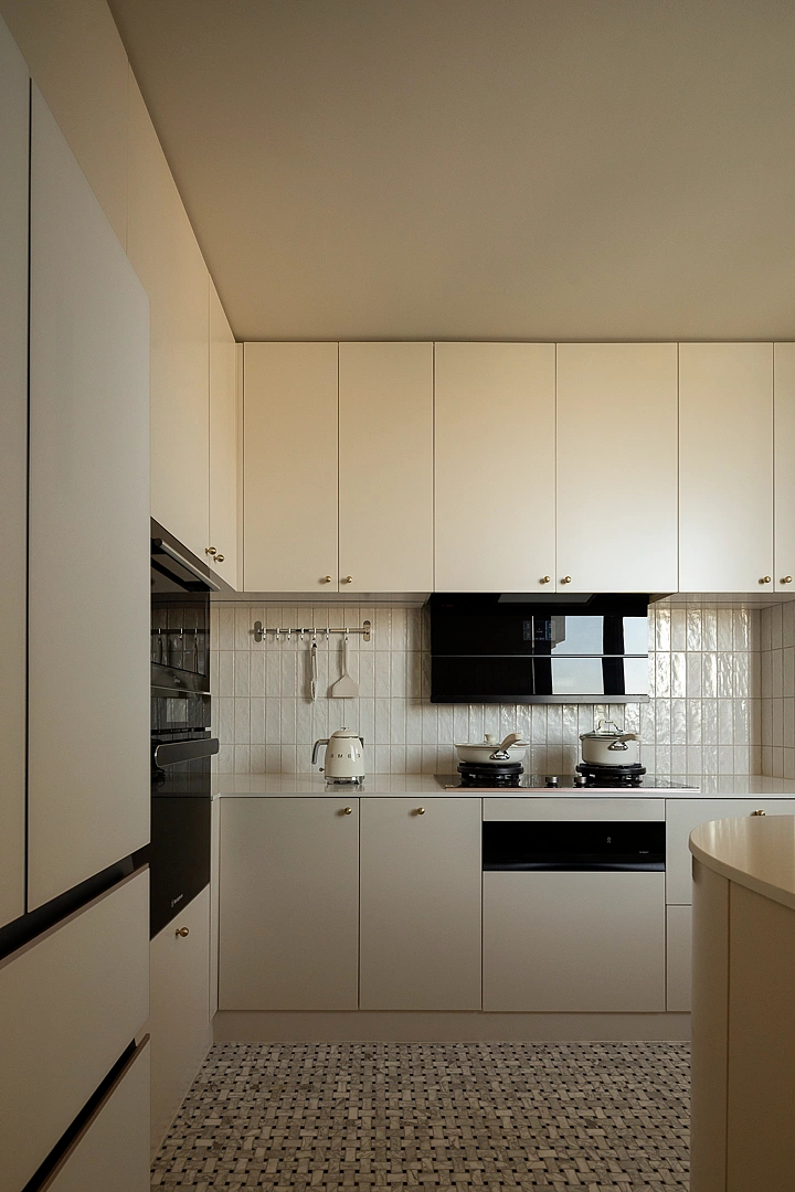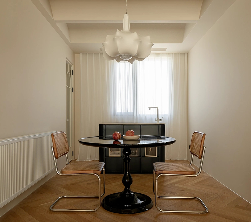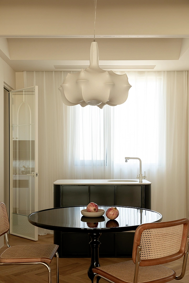 黑色餐桌和浅木色椅子,以及白色的艺术造型吊灯,让人注意到餐厅的位置。木色和黑白色系搭配起来,使空间的功能区域更明显。厨房地毯是花色的,增强了视觉效果,整个厨房以白色为主要的色系,增加用餐愉悦感,烹饪也能舒心。