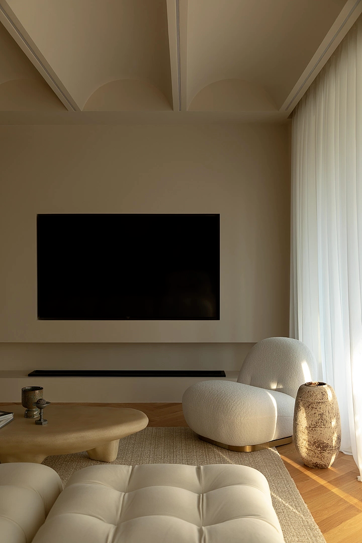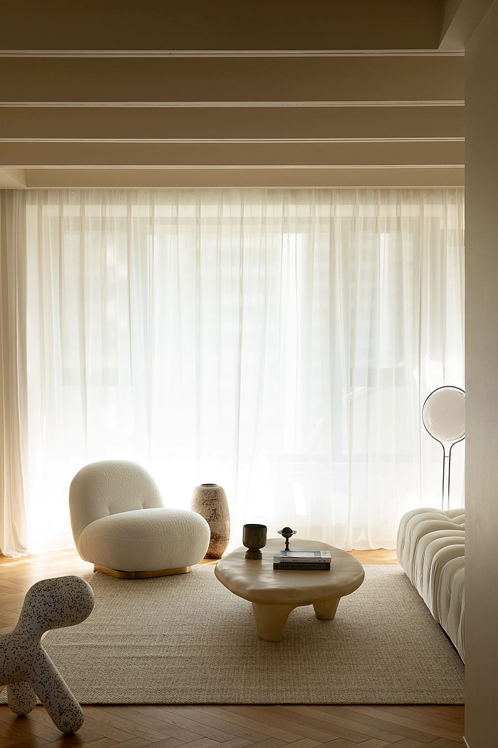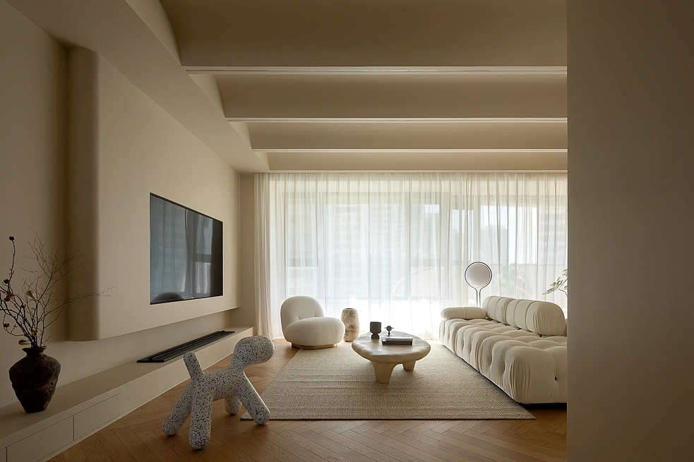 客厅的吊顶设计成半圆形,显得空间更加的开离,层次感拉满,在视觉上感受到强烈的冲击。茶几呈不规则形状,边角圆润,搭配奶油色,显得呆萌可爱又有个性。