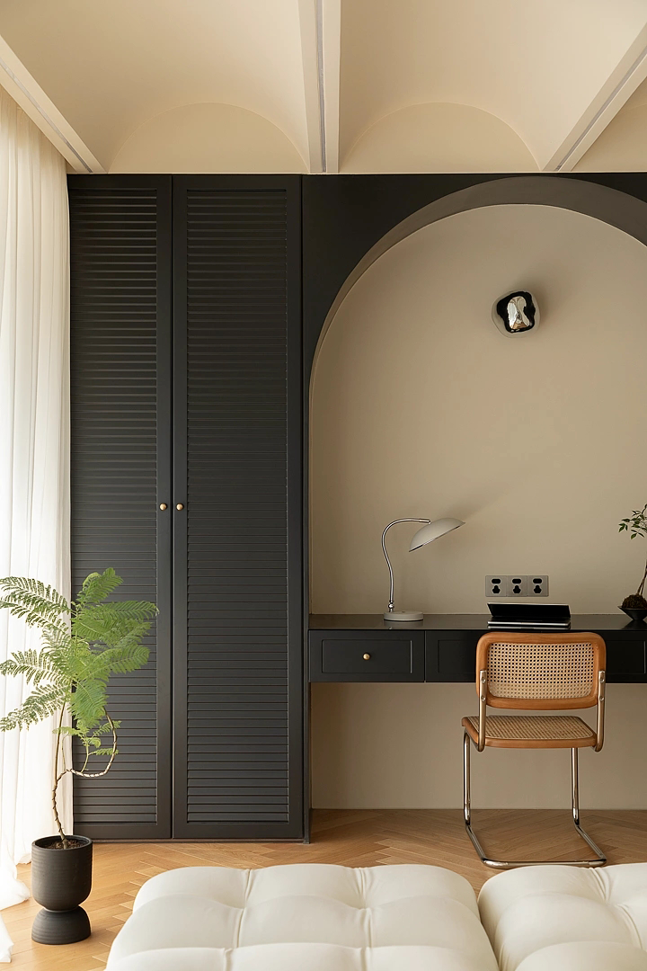 办公区和客厅设计在同一个空间,视野开离,功能性强。办公区的色调以黑色为主,展现出严肃感。书柜的圆拱形门洞设计让空间看起来有复古的感觉。椅子采用原木制作,上面的金属壁灯充满质感,办公学习的氛围很浓郁。