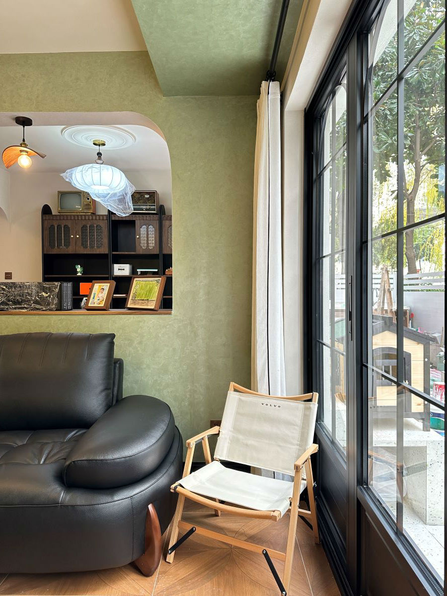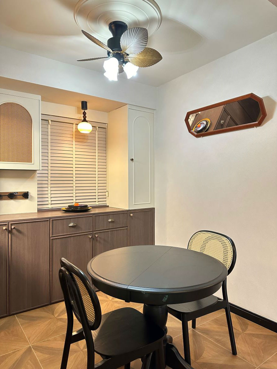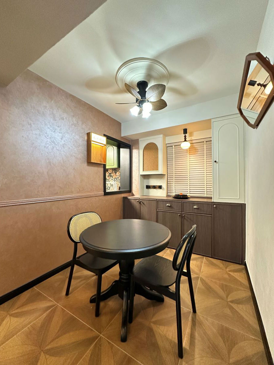 餐厅我们用了木质家具,地面通铺木纹砖,与复古色调的乳胶漆碰撞,复古怀旧的氛围就有了。