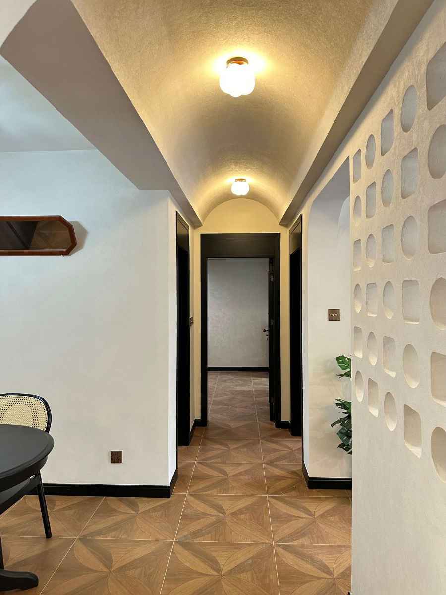 走廊采用拱形门设计,艺术气息瞬间提升一个level!搭配顶部氛围灯,一步一景。