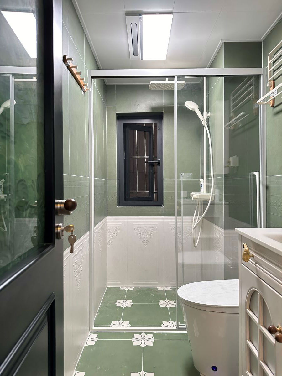 卫生间采用一体盆,台面易于清洁和维护,与墙面地砖搭配和谐,主体色调以白绿相配,清新脱俗。