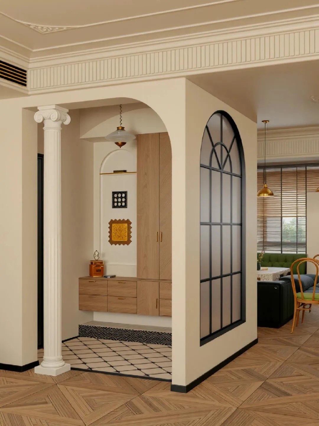 一进门,就被这满满的法式浪漫给撞了个满怀!半拱门的设计,搭配着罗马柱的优雅,还有那格子玻璃的腺陇美,简直是梦幻般的开场。木色的鞋柜静静地守候在一旁,既实用又不失温馨。