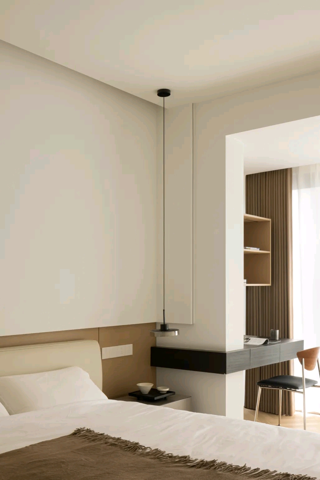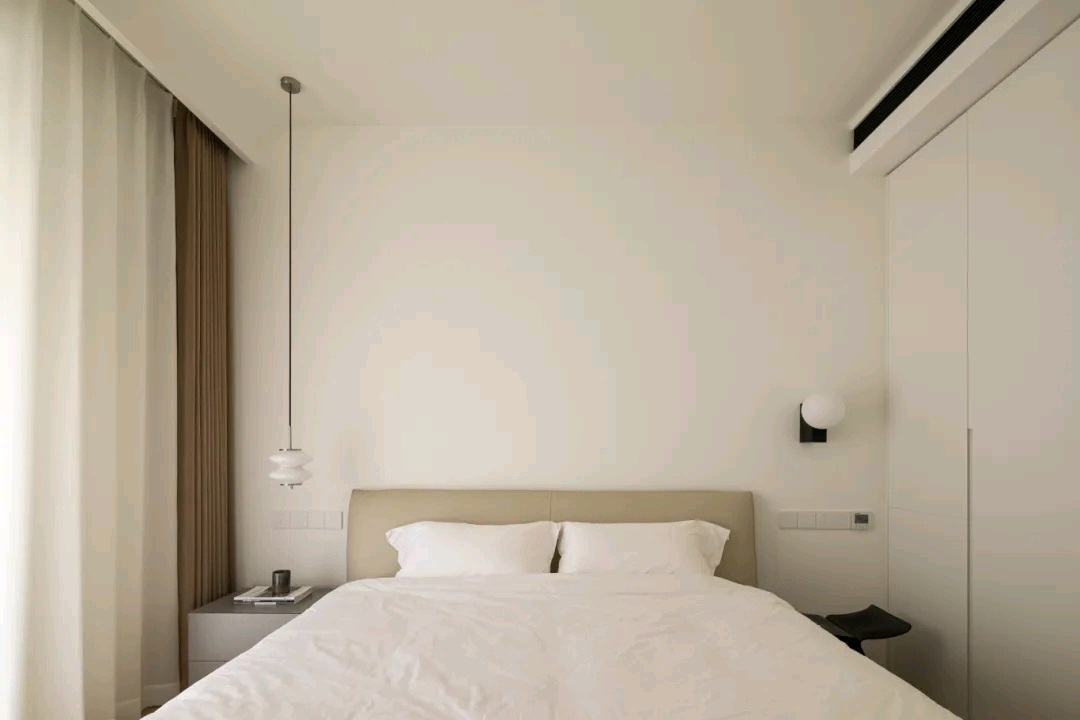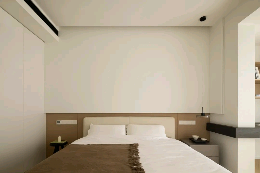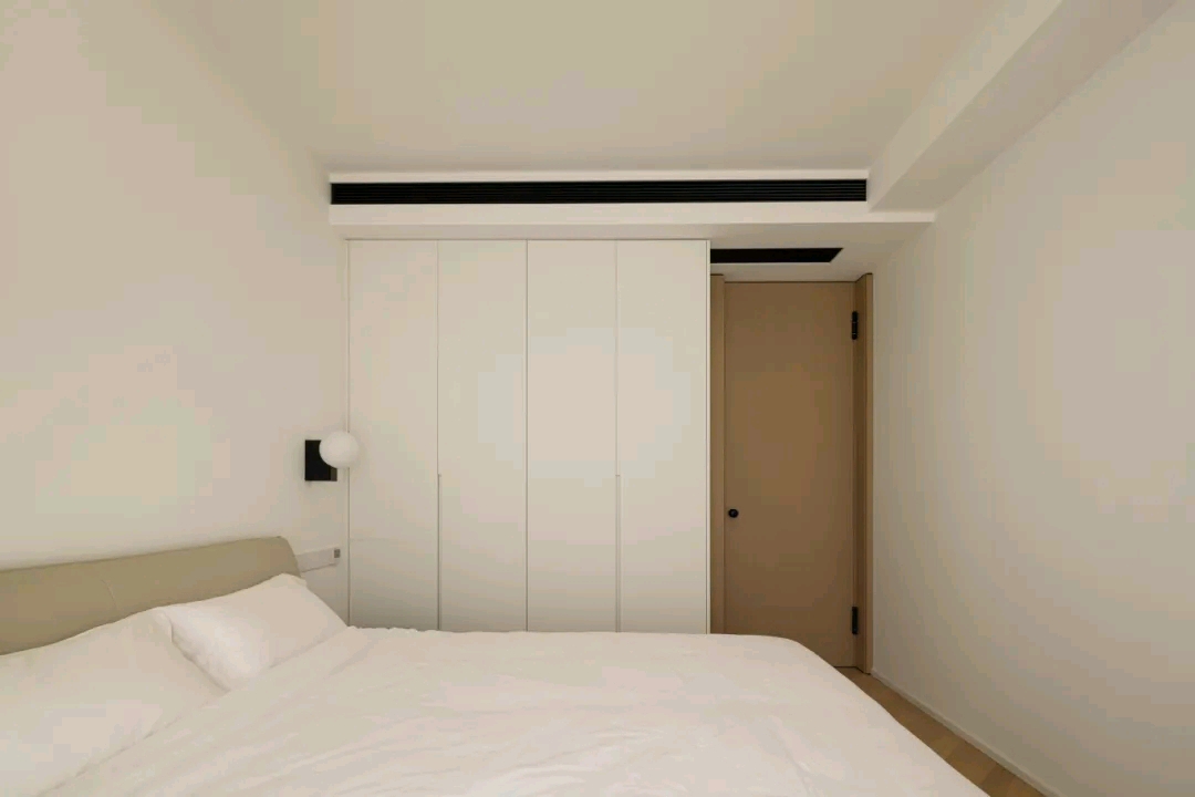 卧室以简约低调为旋律,木质的柜体占据了大部分墙面,简单的直线条勾勒出空间的形态,拼弃一切繁锁的软装,以宁静舒适为最终导向。