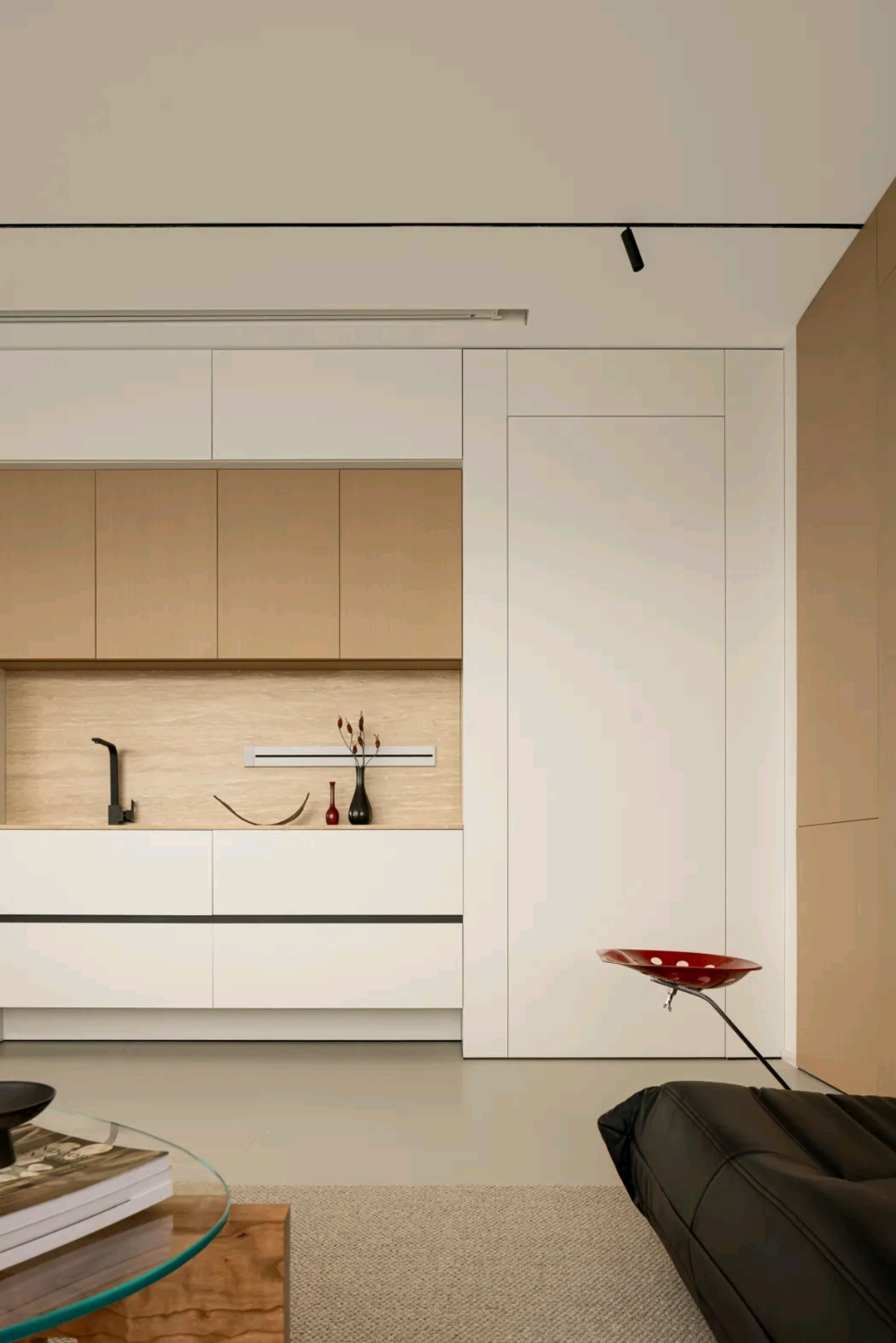 玄关和客厅几作为住宅的“门面担当”,设计师希望它是简单的利落的,有序的,同时大面积的墙壁被改造成隐形橱柜,做收纳使用。