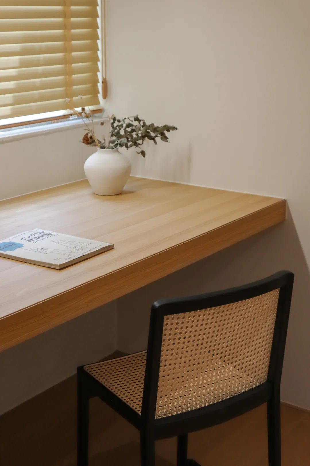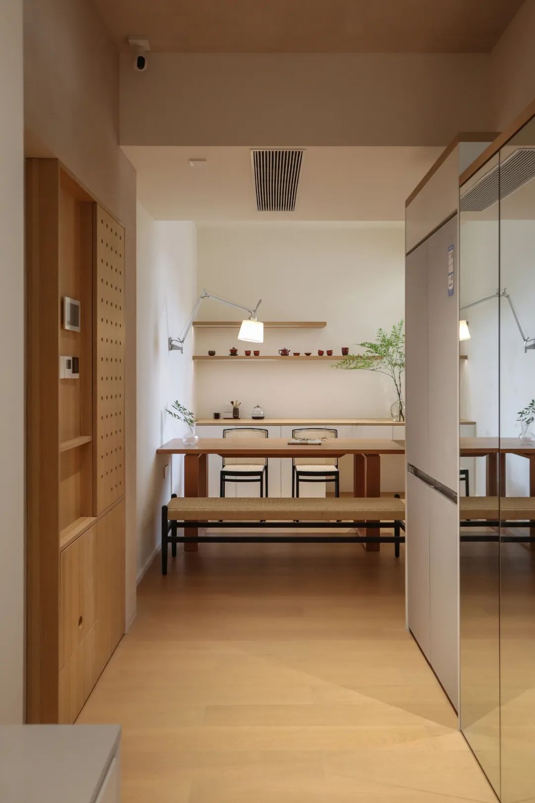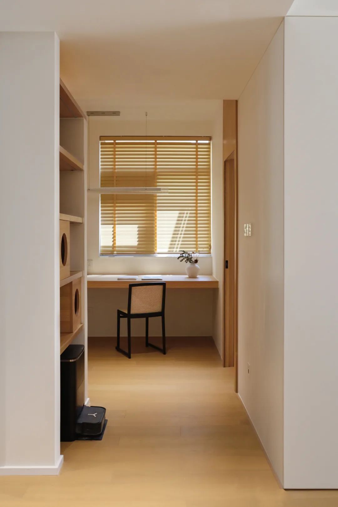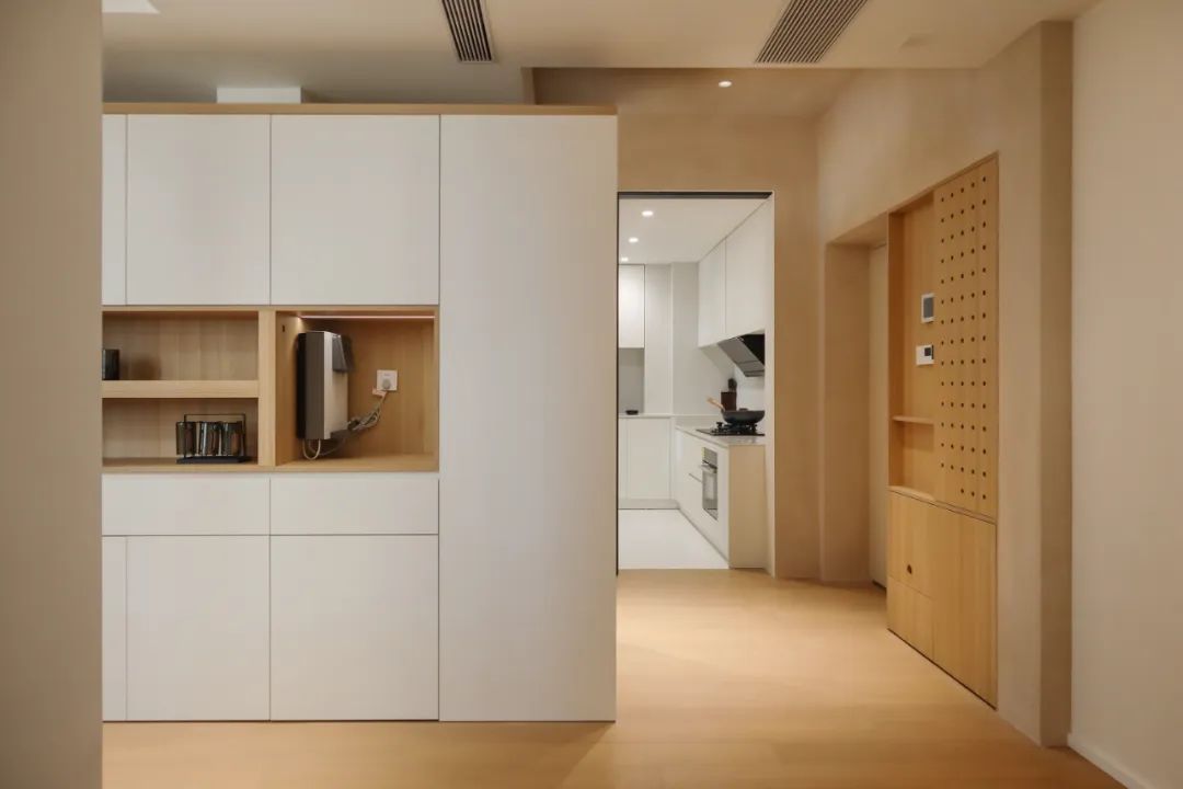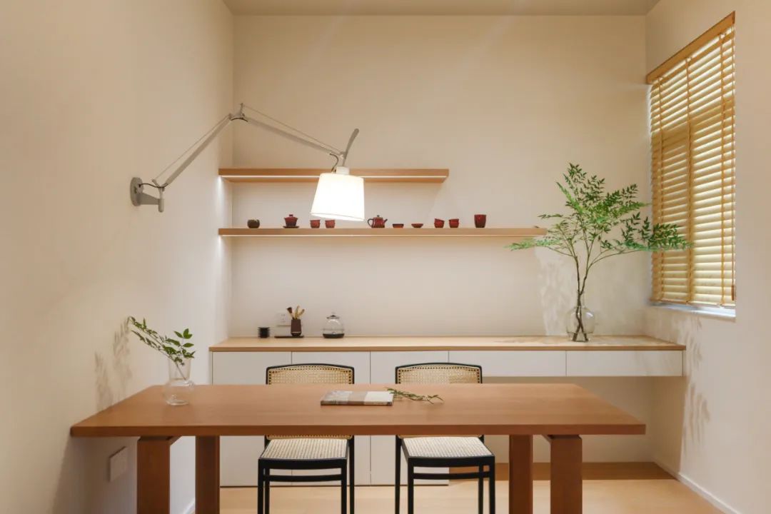 走过餐厅的转角,就来到了书房,玄关柜同样延伸到了这里。地暖设备同样隐藏于此,收纳空间的分配秩序井然。