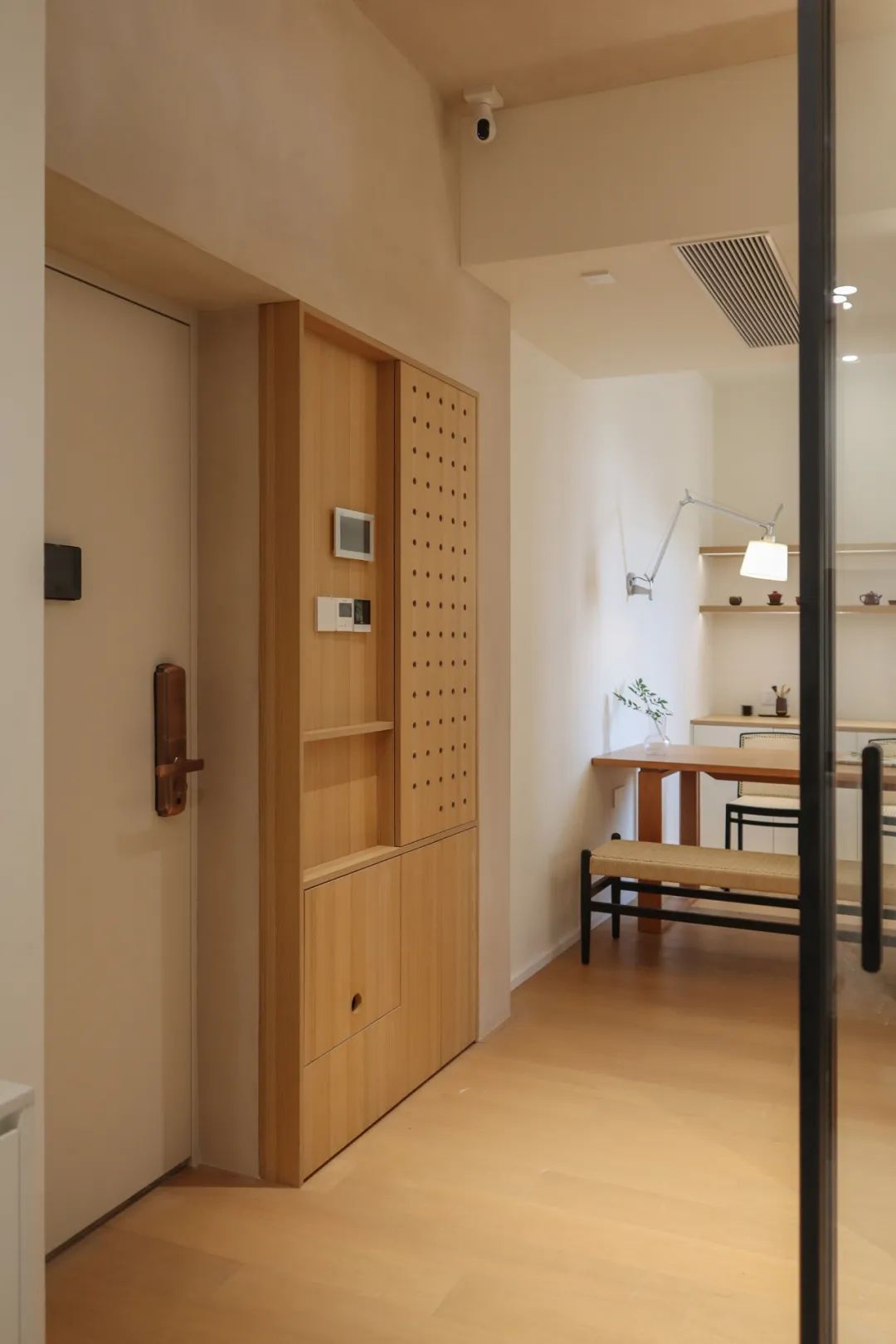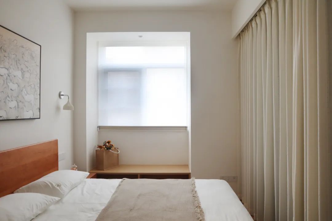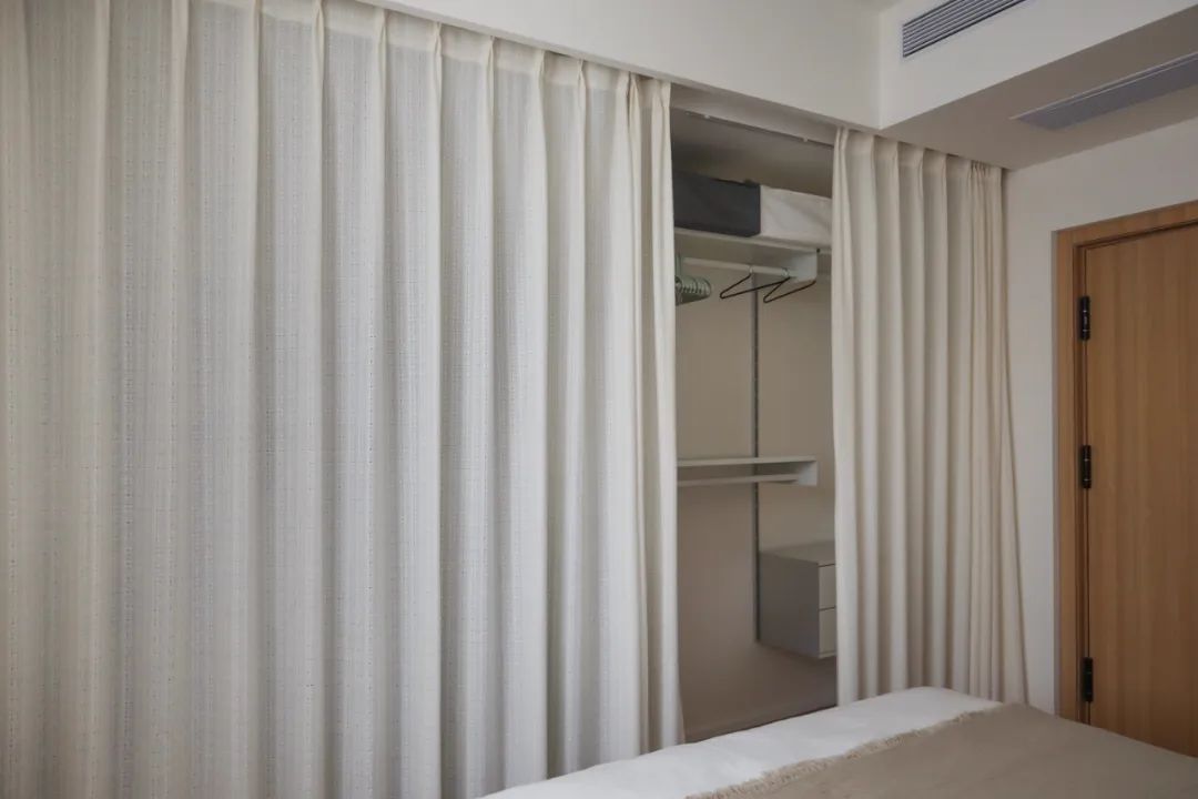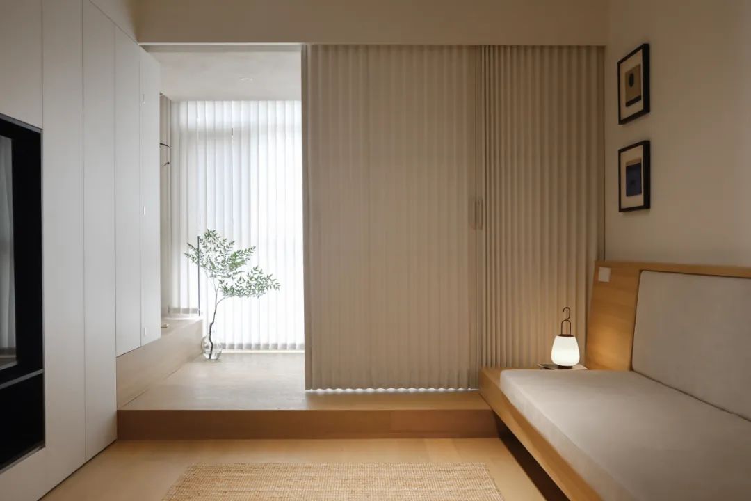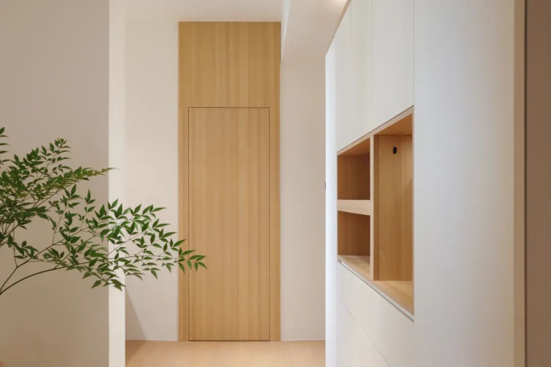 隐藏在过道的一端的主卧门,同样也是家里的一道装饰,“顶天立地”的木饰面造型,充满了视觉的张力。