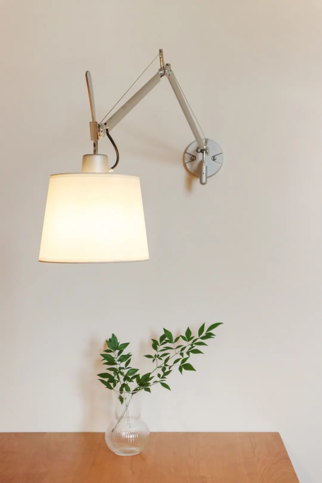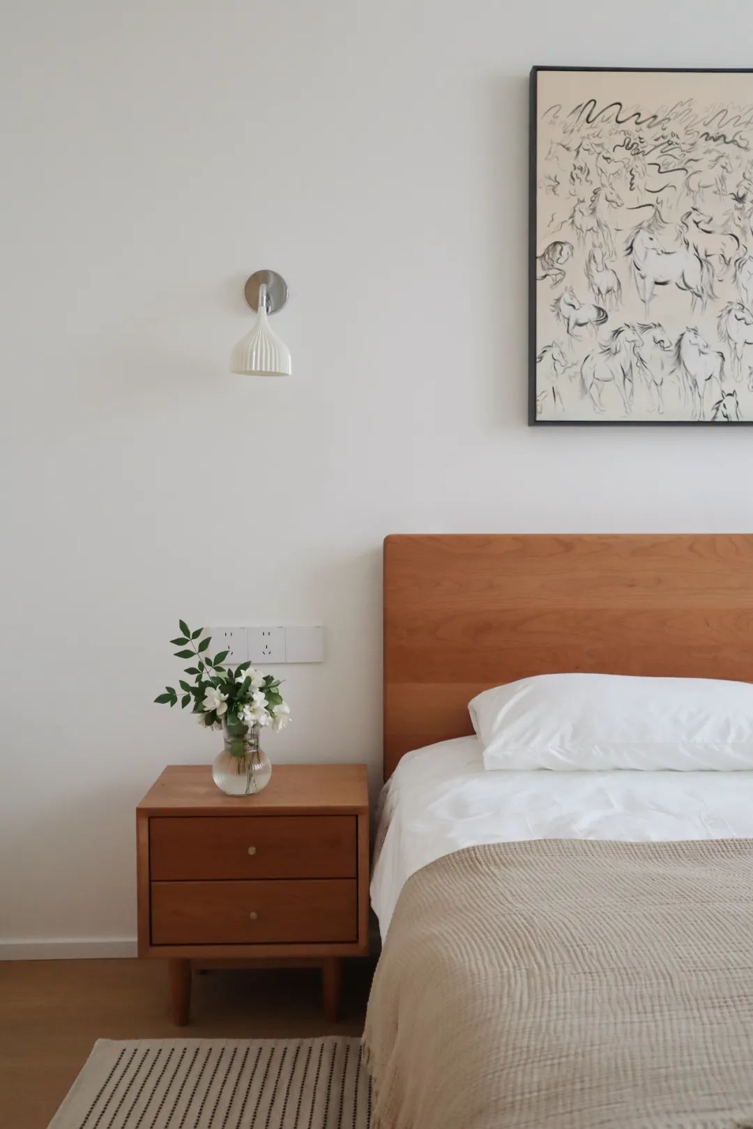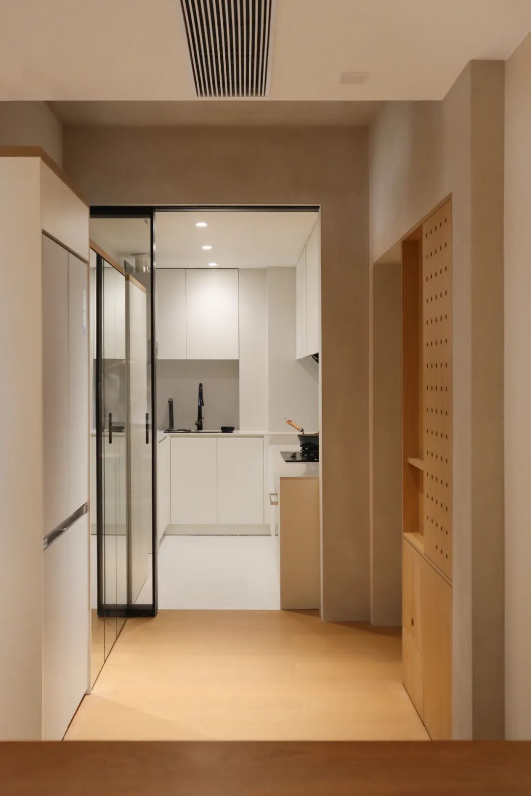 隐藏在过道的一端的主卧门,同样也是家里的一道装饰,“顶天立地”的木饰面造型,充满了视觉的张力。