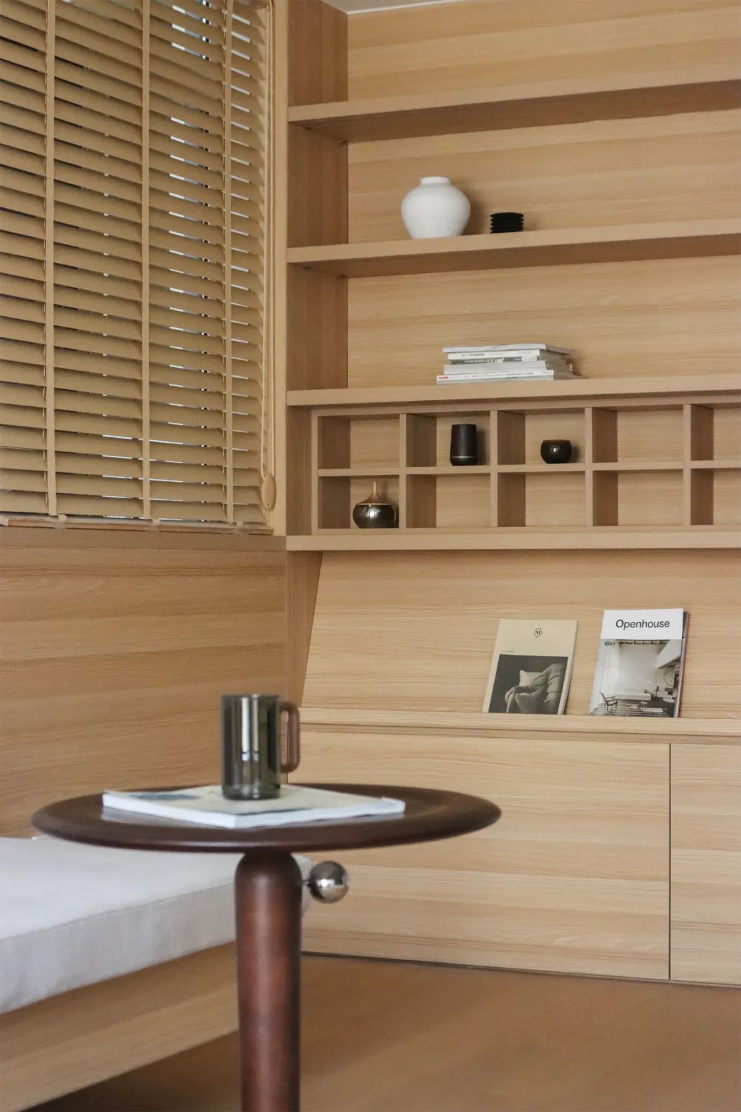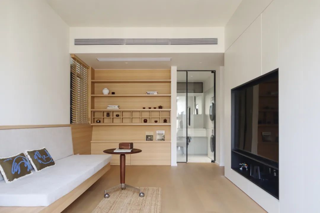 客厅靠近书房的一侧,延续了多面柜的设计语言。这里利用开放式的收纳格,让书籍和藏品找到了充足的空间。