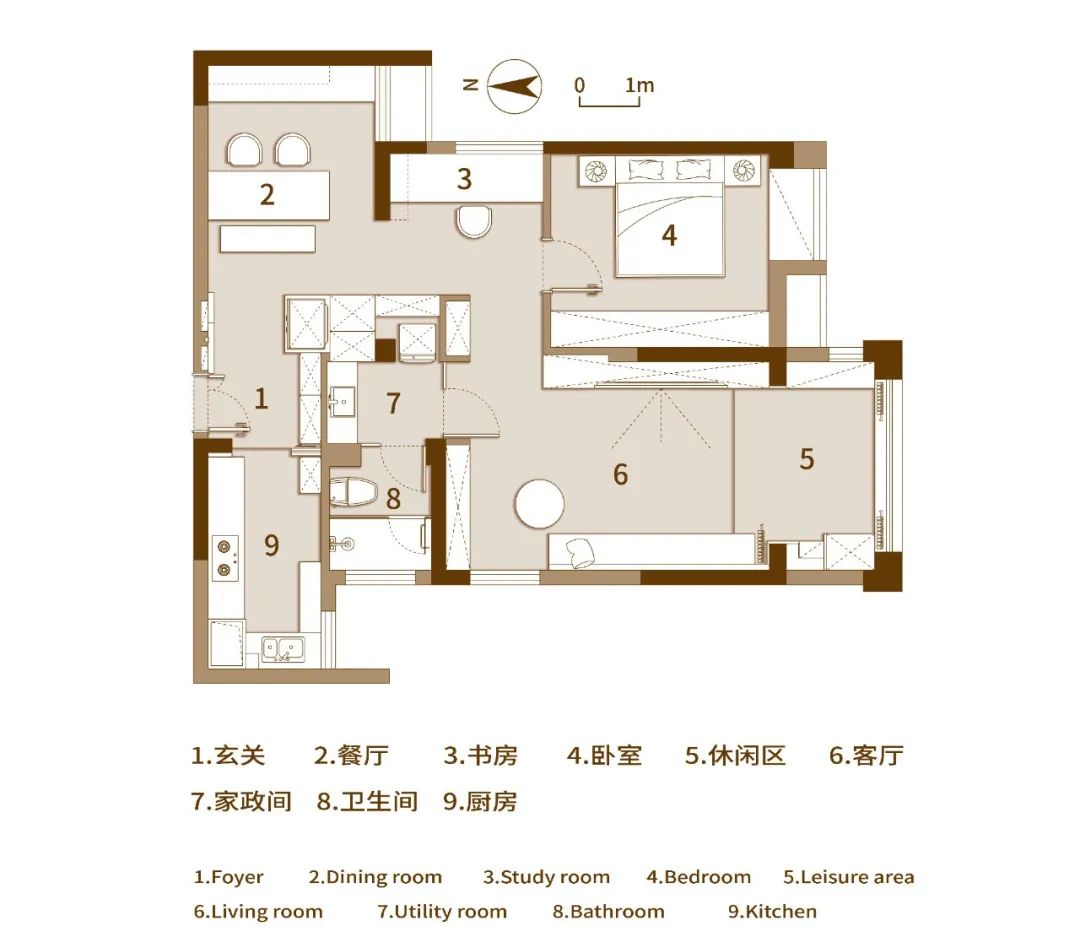 把一间次卧改为餐厅,新增多面柜之后,玄关一下就变得宽敞实用起来。