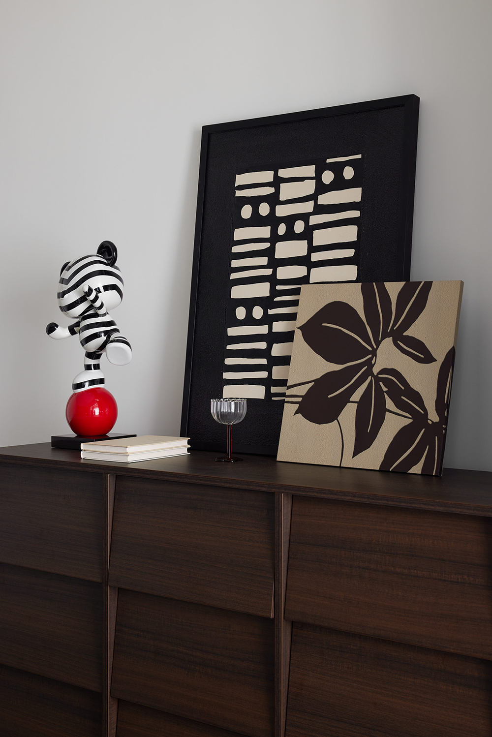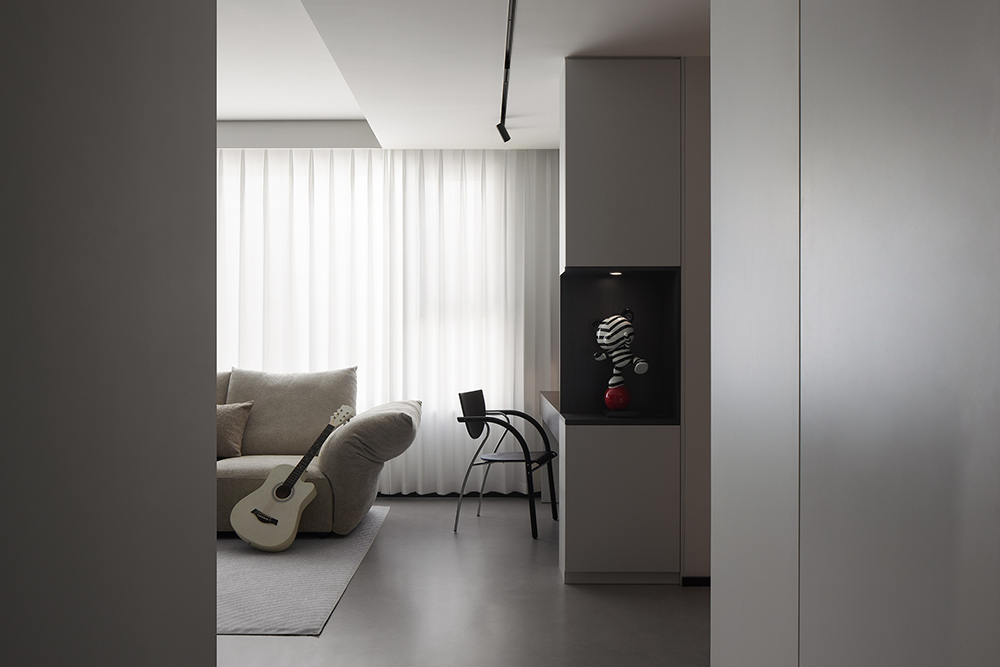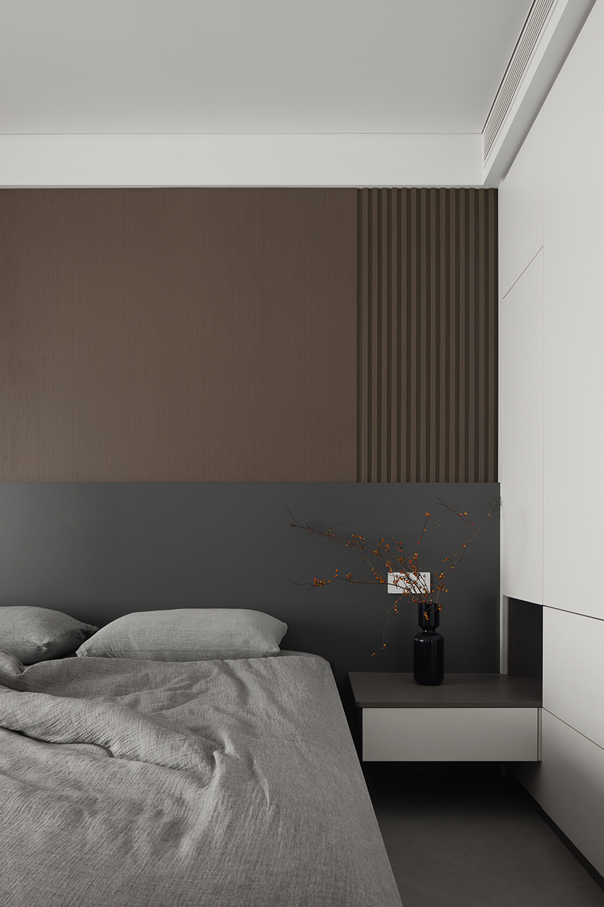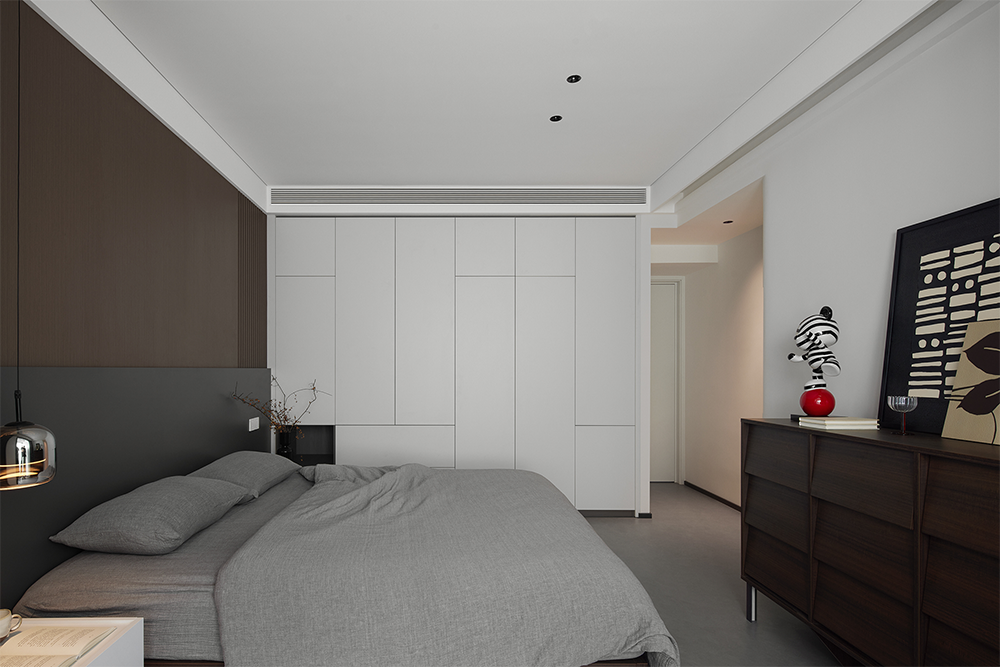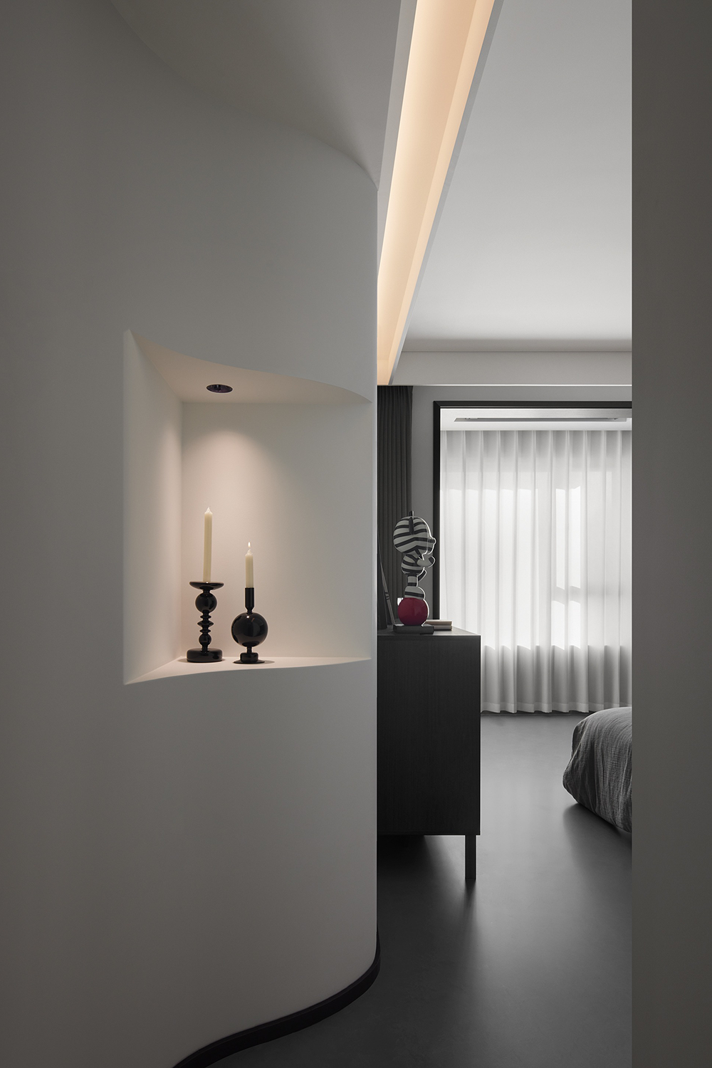 主卧推门进去,映入眼帘的是弧形造型呈现的小景观,黑白的色调搭配木饰面共同组成了床头背景墙,营造出舒适且具有质感的睡眠环境。