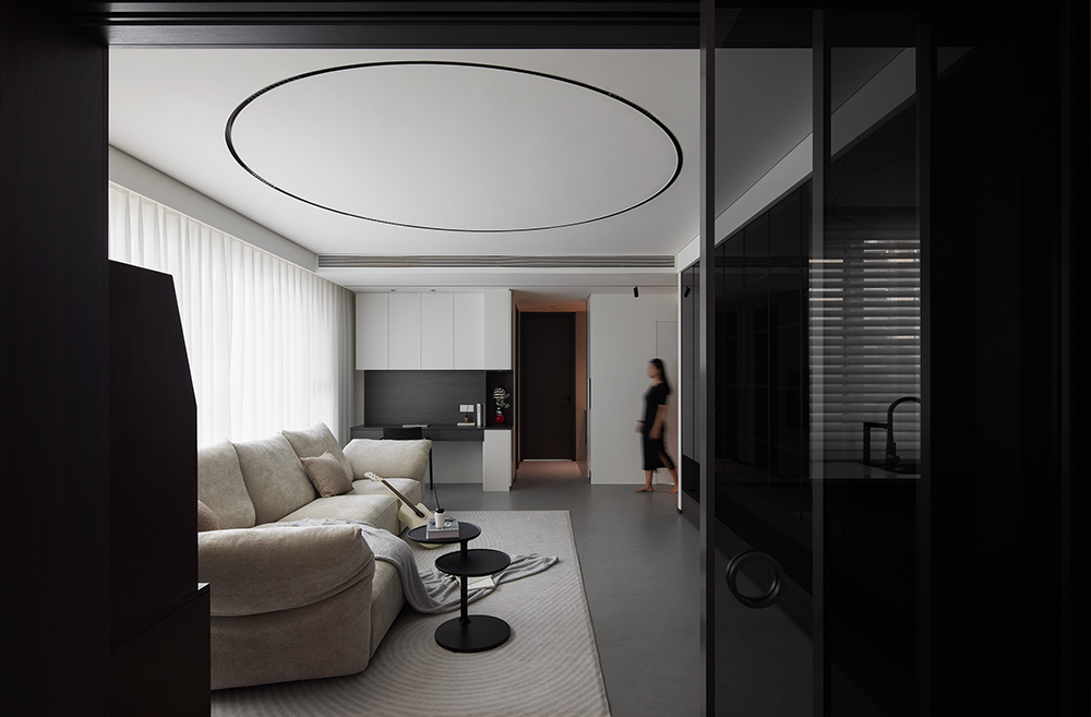 客厅配有整面墙的落地窗,充足的光照让室内明亮通透。顶面圆形的轨道灯搭配无主灯的设计,使整体氛围更加融合。