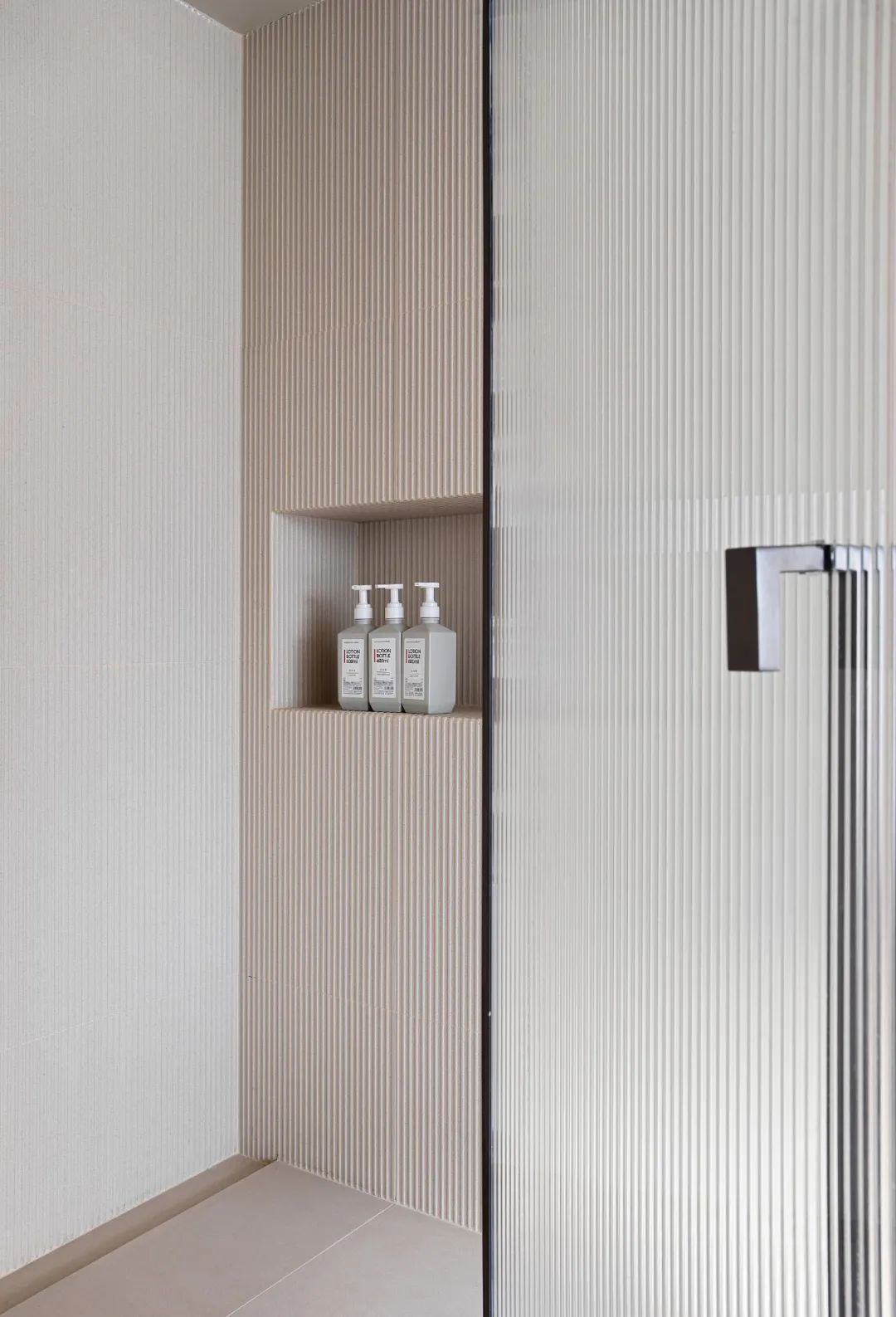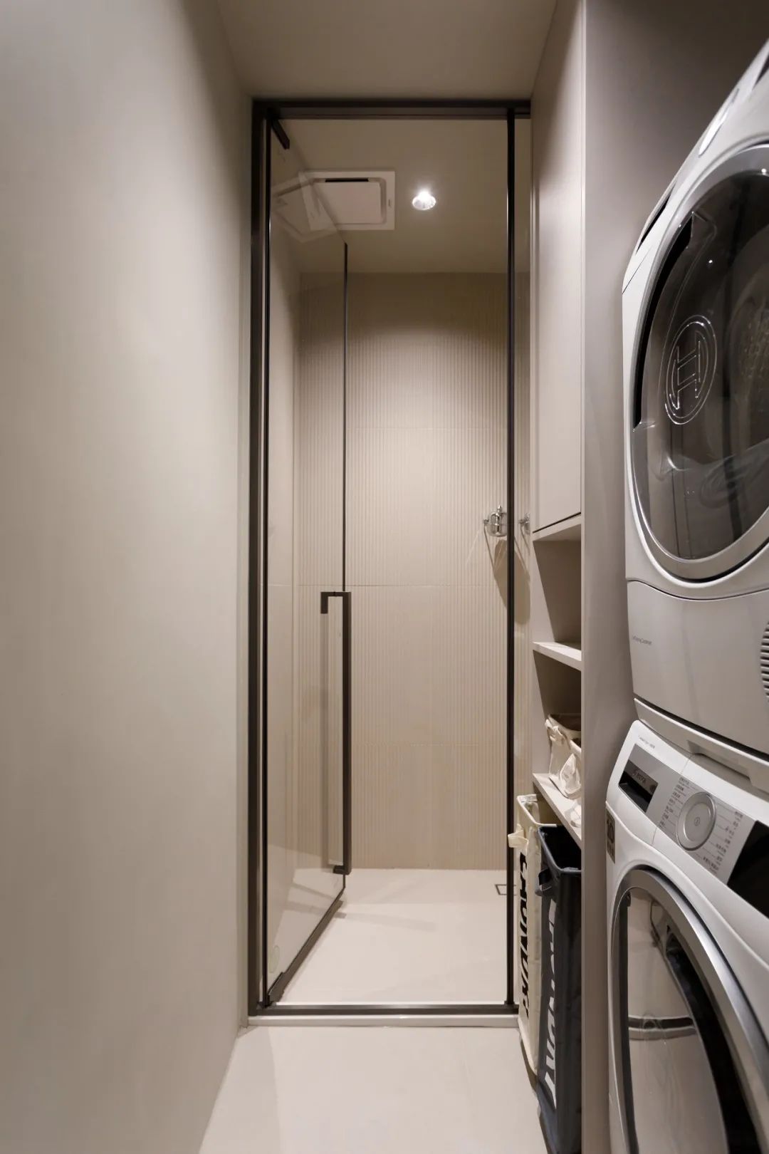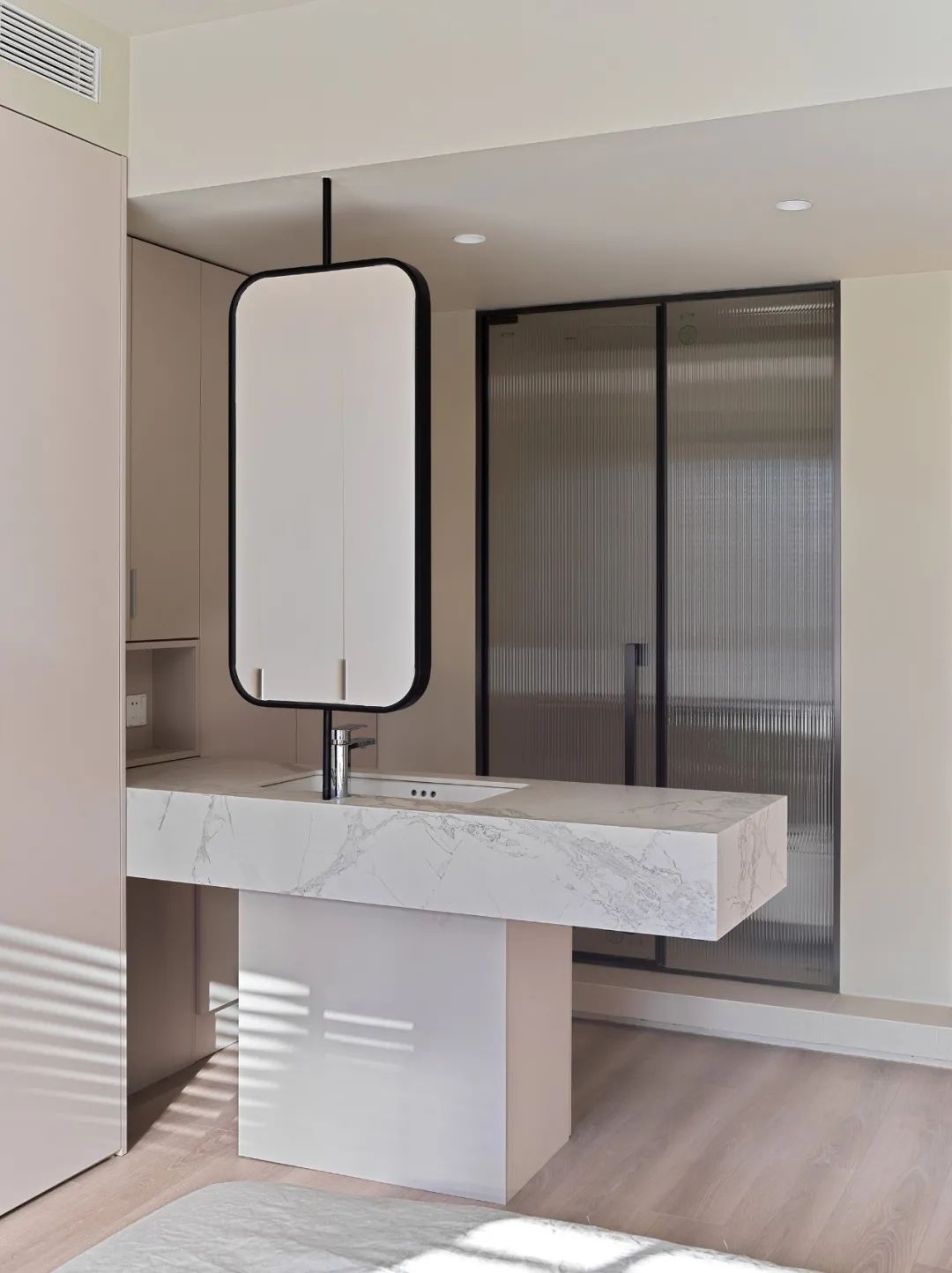 主卫间的非承重墙壁打开,设置了开放式的盥洗区,不仅让卧室的空间感变得更大,还保证了主卧三分离卫生间的功能。