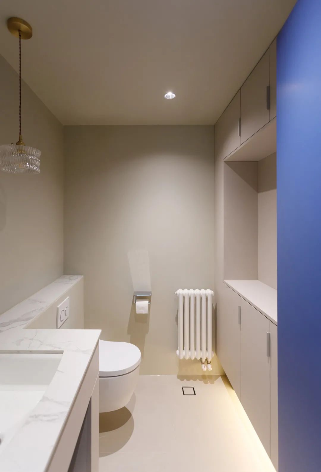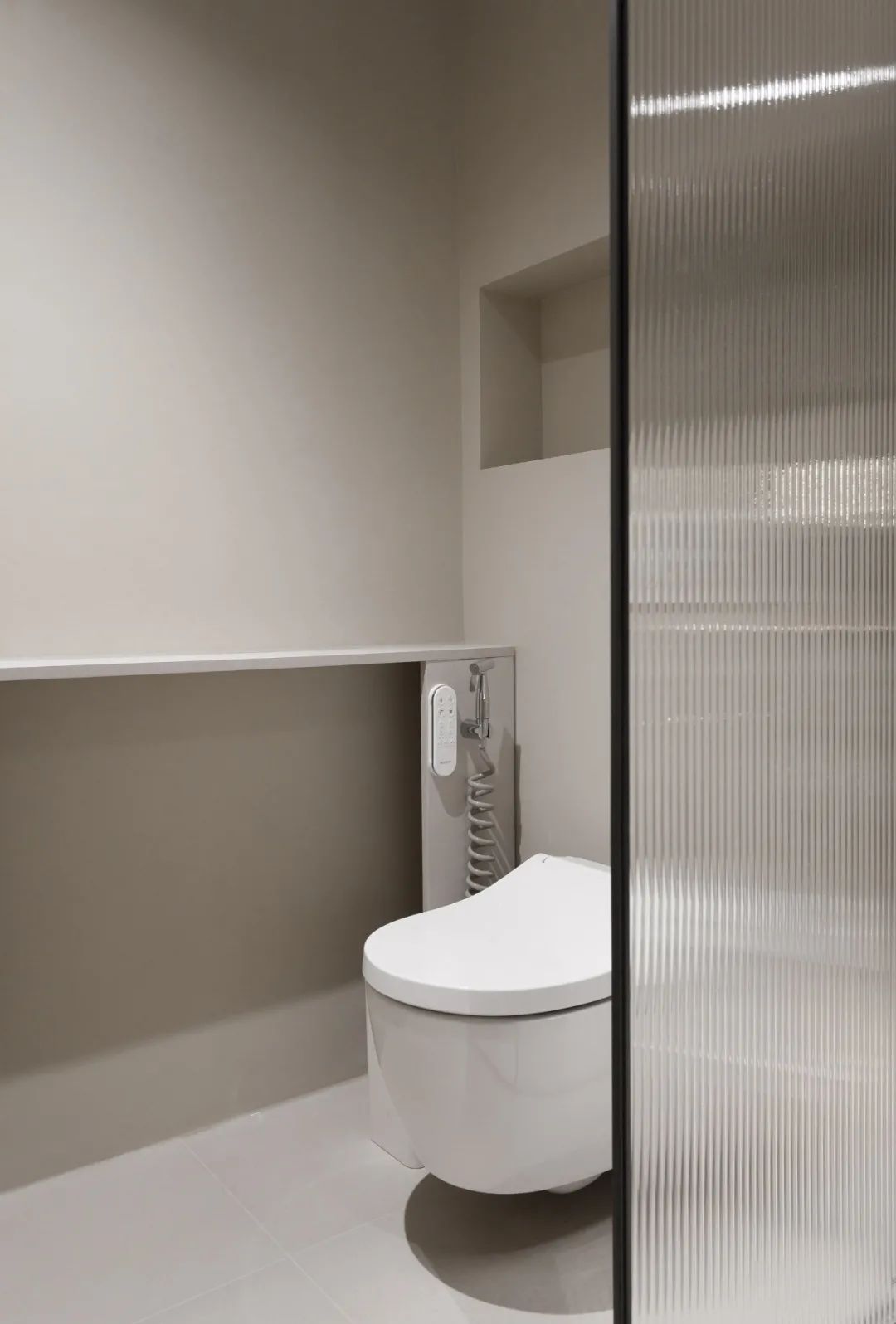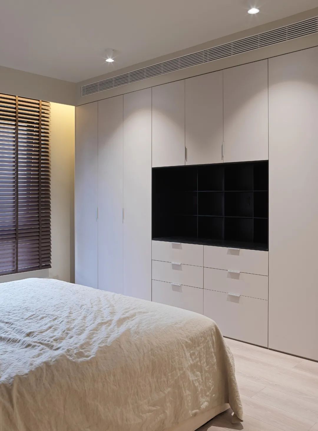 主卫间的非承重墙壁打开,设置了开放式的盥洗区,不仅让卧室的空间感变得更大,还保证了主卧三分离卫生间的功能。