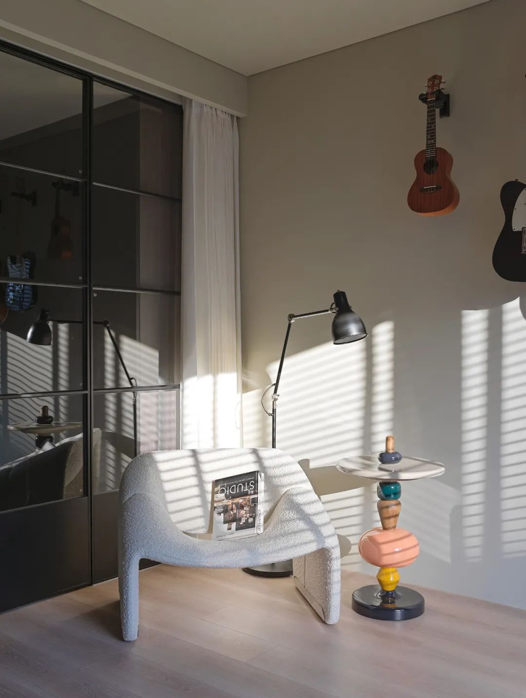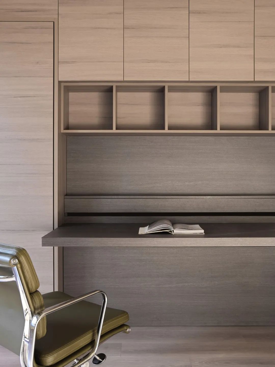 书房桌子依旧秉承轻盈感,书桌直接从柜内延伸出来,柜上的开放收纳,用来放置随时看的书籍。