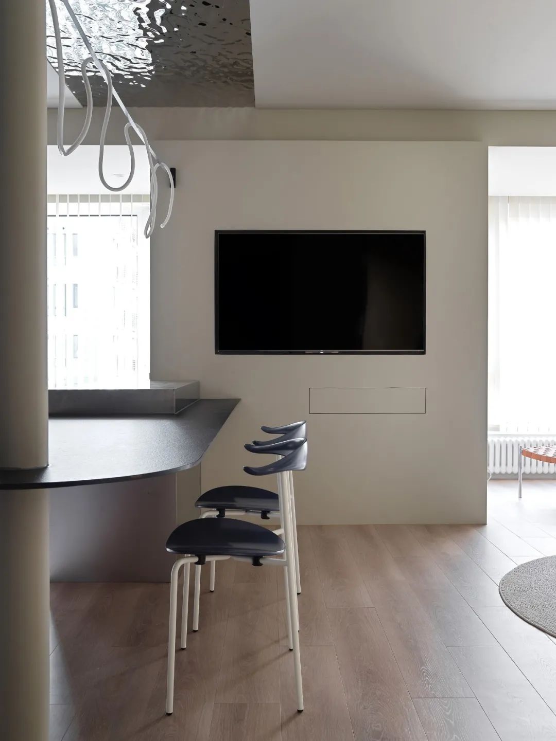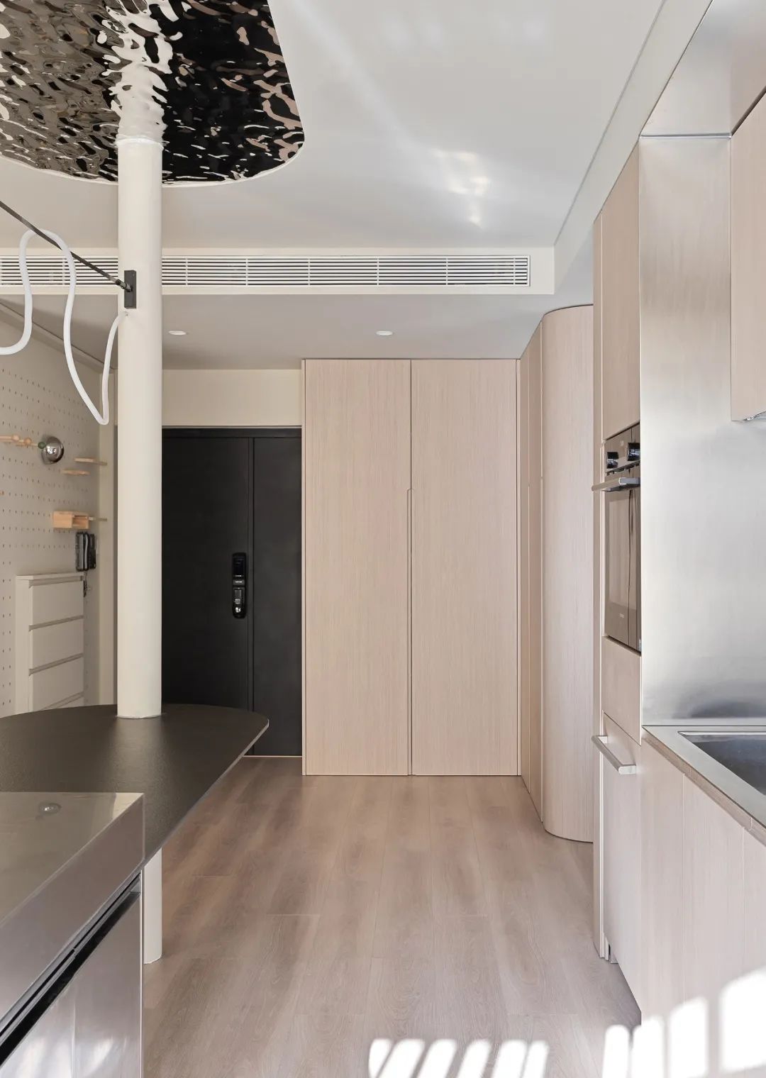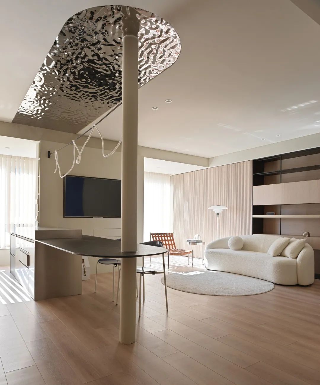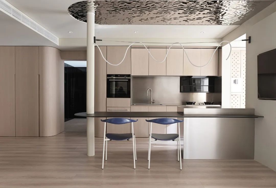 阳台面无法拆除的承重墙做成了餐厅区域,设计师设计了岛台和薄板桌面的组合。无桌脚设计让整个空间更轻盈。