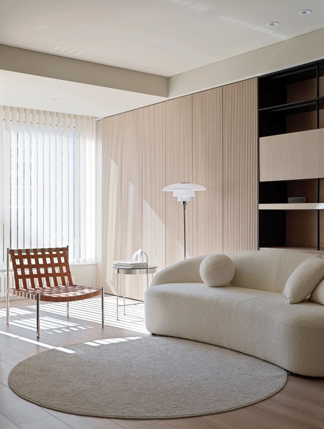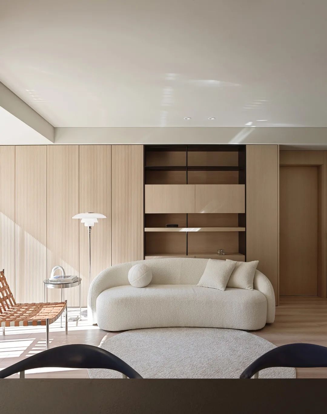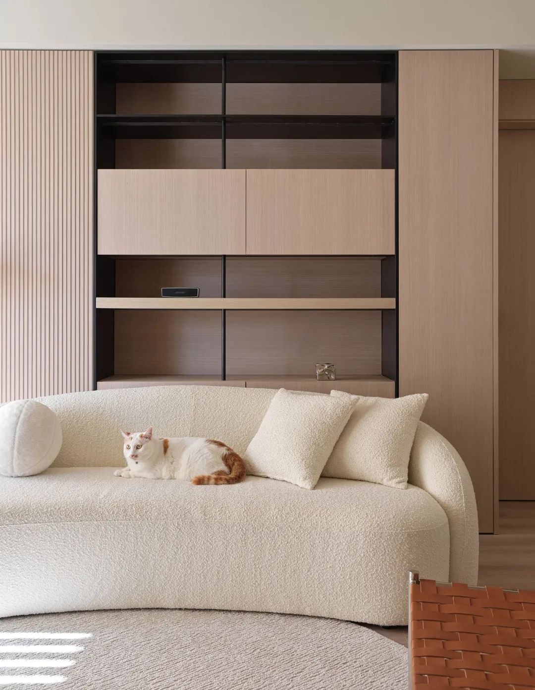 室内主色调使用了原木色。圆润柔软的沙发,搭配栅格式的定制立柜,让整个空间变得都非常放松,舒适。