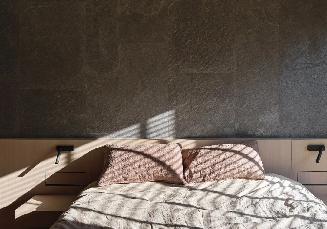 床头墙面用超薄石材搭配木饰面,轻奢搭配让室内空间更舒适。木饰面突出处做了隐形灯带。