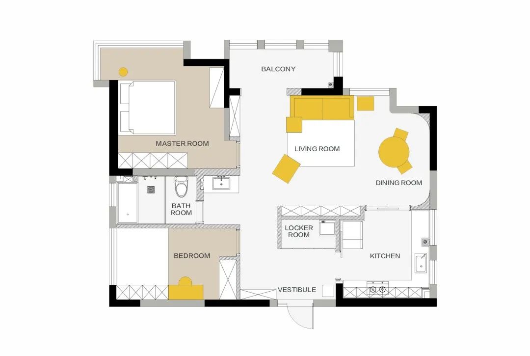 改变主卧进门方向,预留出墙体,设计卫生间干区。卫生间内部,则用于满足泡澡、淋浴、如厕需求。