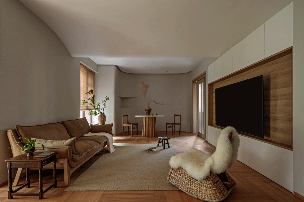 建造一面墙体,入户便形成一处遮挡内部及储物一体的开阔玄关,以折叠柜门方式呈现,用于开启更宽的开合角度,提高实用及便利性。