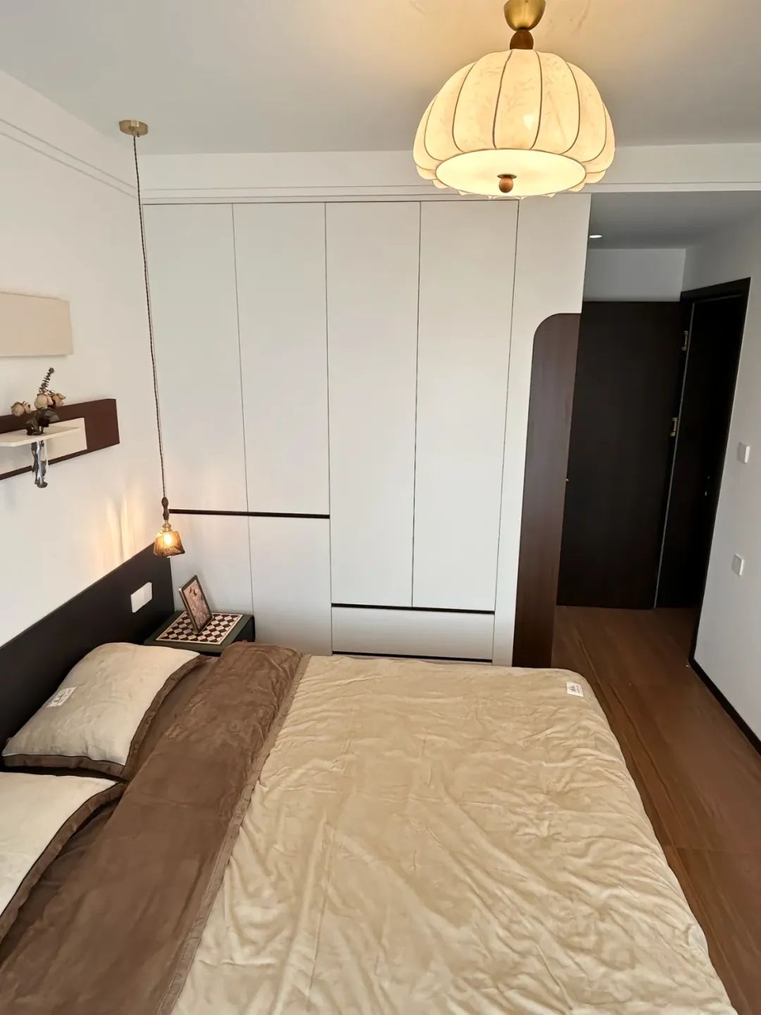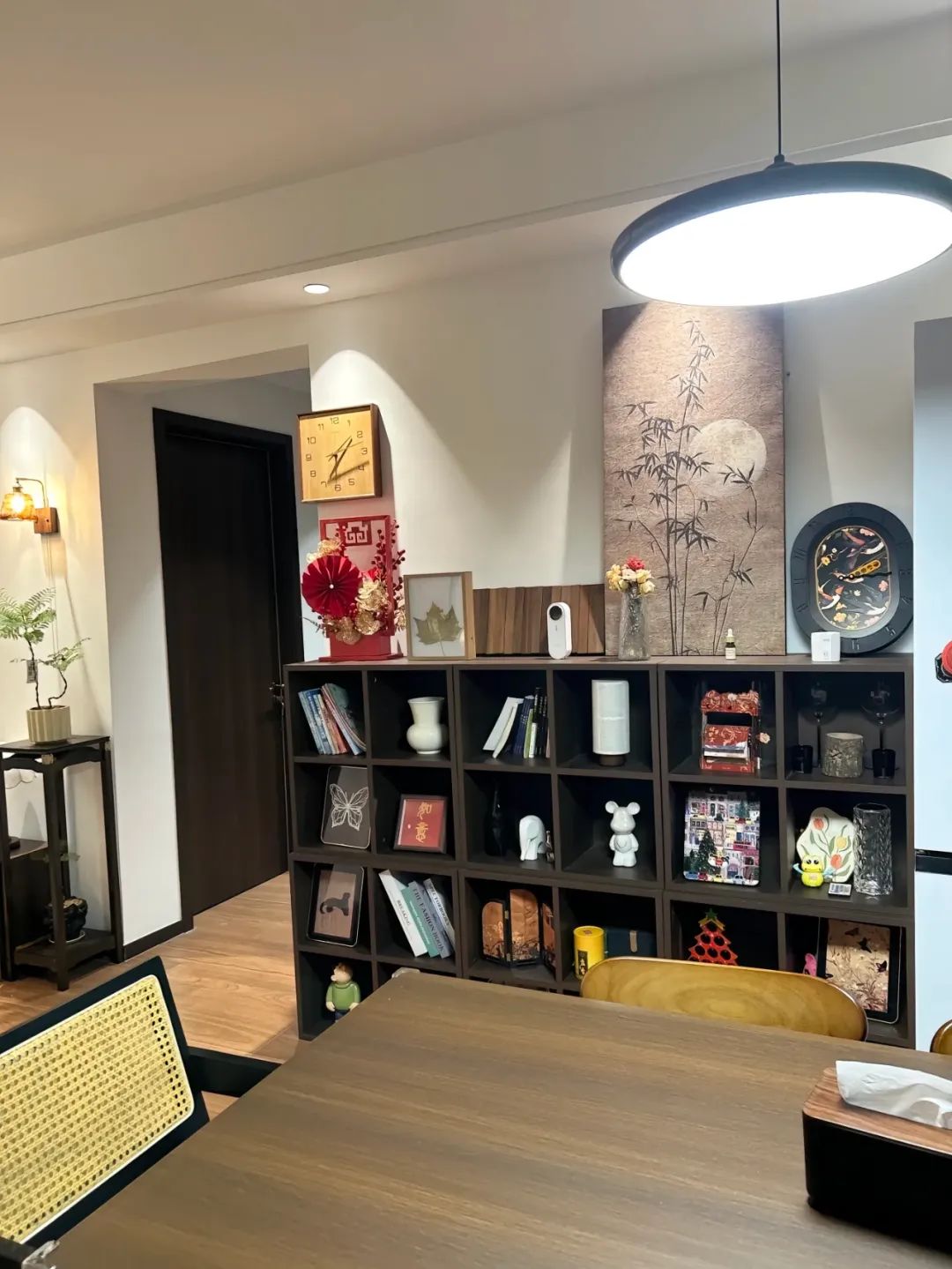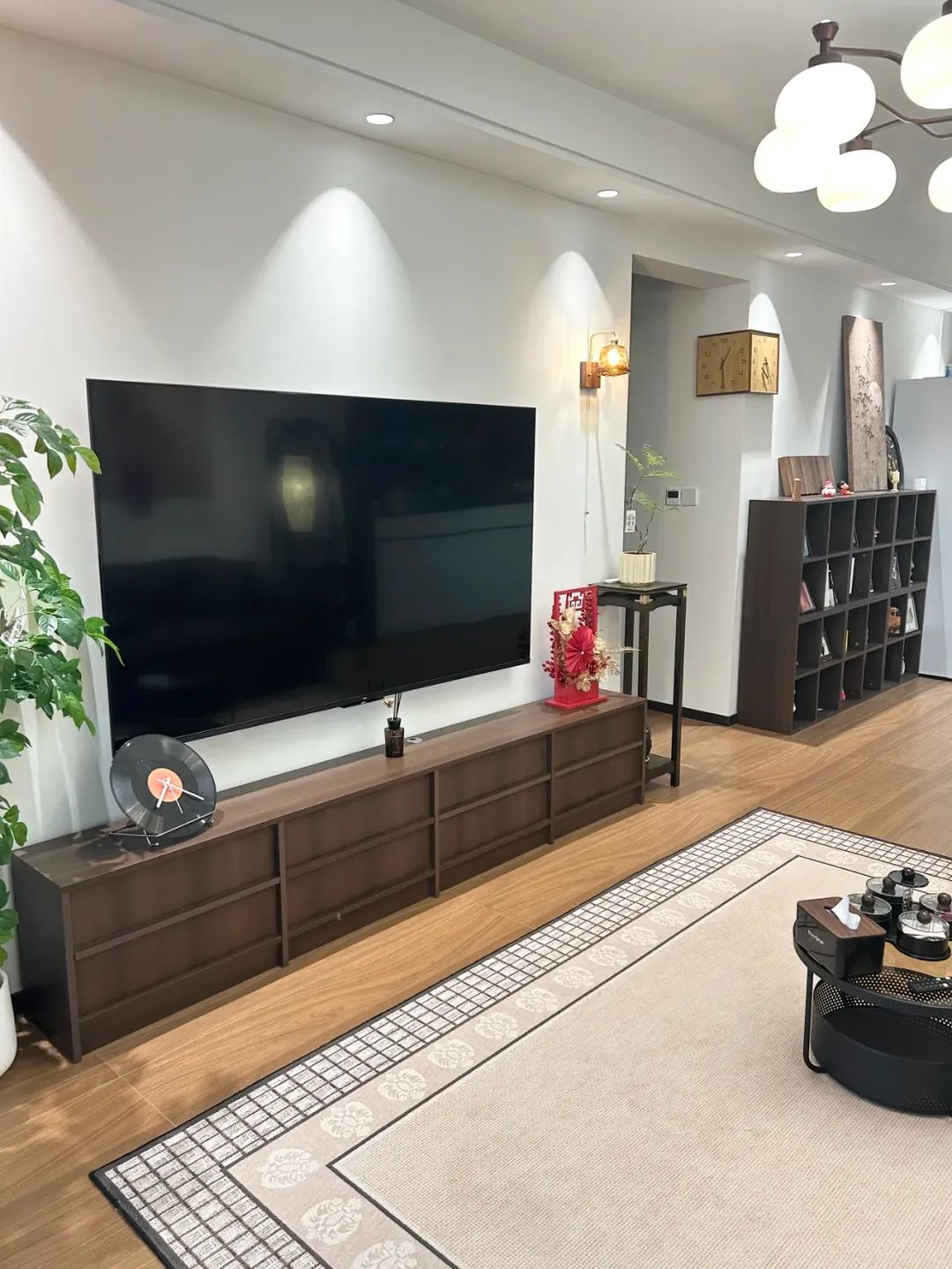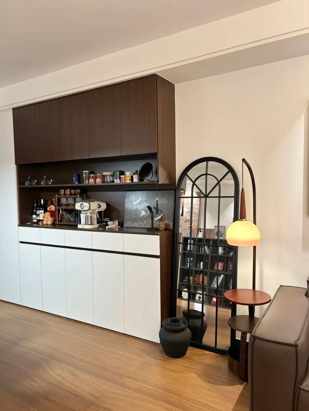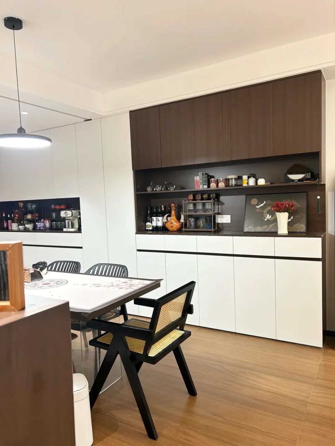 全屋定制了胡桃木+暖白色鞋柜和餐边柜,鞋柜和餐边柜连接处隐藏了厨房的折叠门,